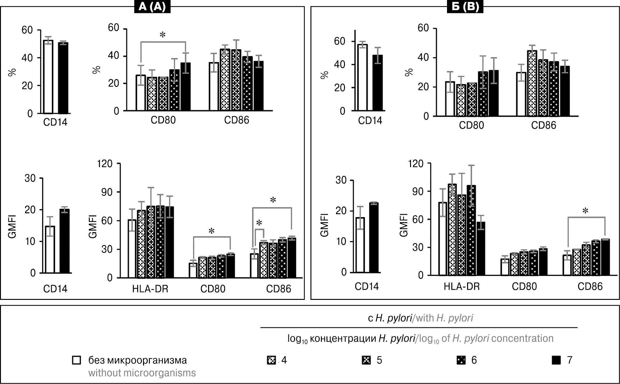 Исследовали ответ моноцитов и лимфоцитов на антигены H. pylori в условиях in vitro. Двадцатичасовое культивирование моноцитов крови взрослых здоровых доноров с H. pylori вызывало усиление экспрессии моноцитами мембранных молекул CD80 и CD86, необходимых для дополнительной стимуляции Т-лимфоцитов в ходе презентации антигенов (так называемых костимулирующих молекул). Это усиление экспрессии проявлялось в росте геометрической средней интенсивности флюоресценции (GMFI) окрашенных молекул CD80 и CD86, а также в увеличении доли CD80+ клеток при максимальной использованной концентрации H. pylori 107 бактерий/мл (рис. 2А). Повышение GMFI образцов клеток, окрашенных в стандартных условиях, расценивалось нами как свидетельство увеличения среднего количества костимулирующих молекул на одной клетке. При культивировании часть моноцитов утрачивала свой линейный маркер CD14, однако этот процесс не зависел от наличия H. pylori в культуре. Также добавление H. pylori не влияло на экспрессию молекулы главного комплекса гистосовместимости II класса HLA-DR. Культивирование моноцитов с H. pylori в течение 44 ч не приводило к дополнительному росту экспрессии молекул, ассоциированных со стимуляцией лимфоцитов (рис. 2Б). В связи с этим в дальнейшей работе мы инкубировали моноциты 20 ч с H. pylori в концентрации 107 бактерий/мл.