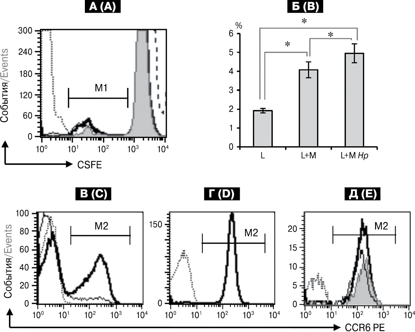 Рисунок 3. Моноциты, нагруженные H. pylori, усиливают пролиферацию лимфоцитов (А, Б), но не вызывают потерю рецептора CCR6 CD4+ Т-клетками (В-Д). Примечание. А) Краситель CFSE в лимфоцитах, росших без моноцитов (гистограмма с серым полем), и в лимфоцитах, росших с моноцитами, не нагруженными (тонкая черная линия) и нагруженными H. pylori (толстая черная линия). Отрезок М1 отмечает делившиеся клетки. Клетки, свежеокрашенные CFSE, обозначены пунктиром. Неокрашенные клетки здесь и на следующих графиках обозначены точечной линией. Б) Доля делившихся лимфоцитов в культурах лимфоцитов (L) и в смешанных культурах лимфоцитов с моноцитами, не нагруженными (L+М) и нагруженными H. pylori (L+М Нр). Данные представлены как M±SEM (N = 9). Знак * отмечает p < 0,01 в парном Т-тесте Стьюдента. Экспрессия CCR6 на CD4+ (толстая линия) и CD8+ (тонкая линия) лимфоцитах крови до разделения (В), на очищенных CCR6+CD4+ Т-клетках (толстая линия) непосредственно после выделения (Г) и через 3 суток культивирования без моноцитов (гистограмма с серым полем) или с моноцитами, ненагруженными (тонкая линия) и нагруженными H. pylori (толстая линия) (Д). Отрезки М2 отмечают CCR6+ клетки.