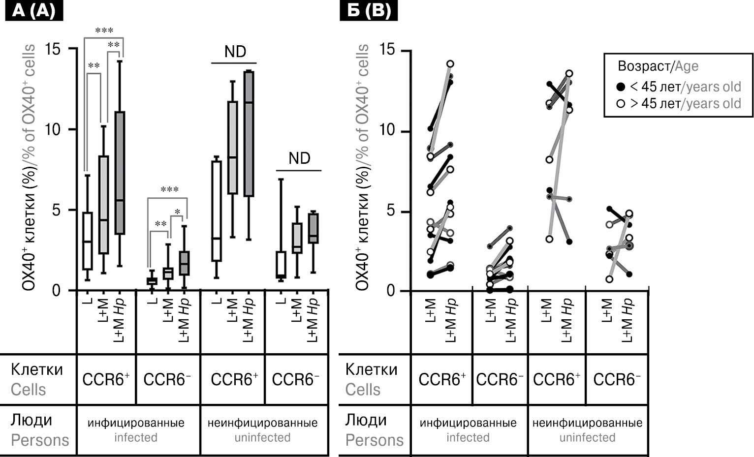 Рисунок 4. Доля активированных ОХ40+ лимфоцитов среди CD4+ Т-клеток, различающихся по экспрессии CCR6, в культурах лимфоцитов (L) и в смешанных культурах лимфоцитов с моноцитами, не нагруженными (L+М) и нагруженными антигенами H. pylori (L+М Нр). Примечание. А) Медиана, нижний и верхний квартили, минимальное и максимальное значение представлены в виде коробчатой диаграммы. Результаты сравнения в ранговом тесте согласованных пар Уилкоксона показаны следующими знаками: *р < 0,01; **p < 0,005; ***p < 0,001. Б) Данные представлены в виде индивидуальных значений с разделением обследованных по возрасту.