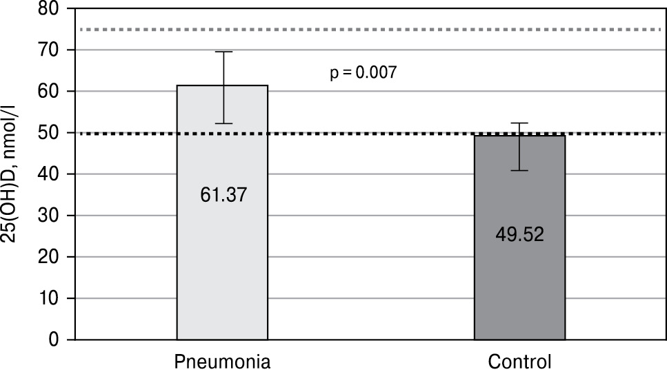 Only 19,6% (n = 20) of the healthy children and 32.6% (n = 32) of pneumonia patients were found to be vitamin D supplemented. Median vitamin D intake in the healthy children group was 200 IU/day, whereas patients in both subgroups were receiving 500 IU — a significantly higher dose than controls by the time of study measurement (p = 0.013).