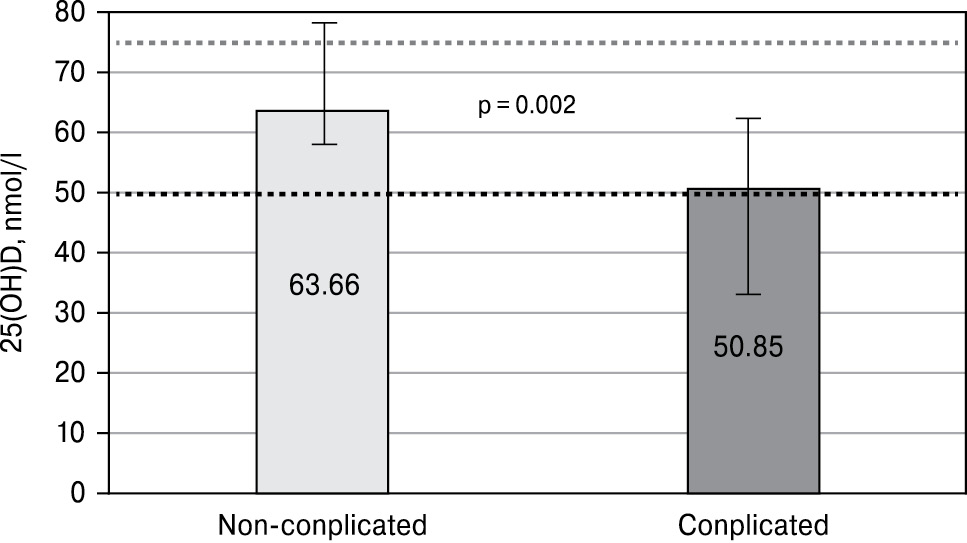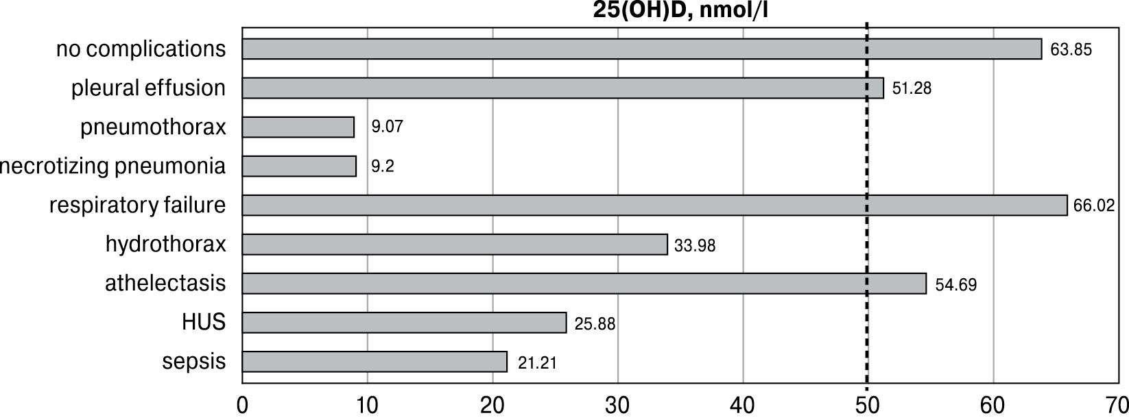 ОR for developing complicated pneumonia if 25-hydroxyvitamin D level was below 51 nmol/l was 1.925 times higher (CI 95% 1.15–3.20). Mortality rate due to pulmonary complications in the complicated pneumonia subgroup was 8.3%, accounting for 3 cases. Their vitamin D levels were within the deficiency and severe deficiency state — 9.0 nmol/l, 9.2 nmol/l and 35.3 nmol/l.