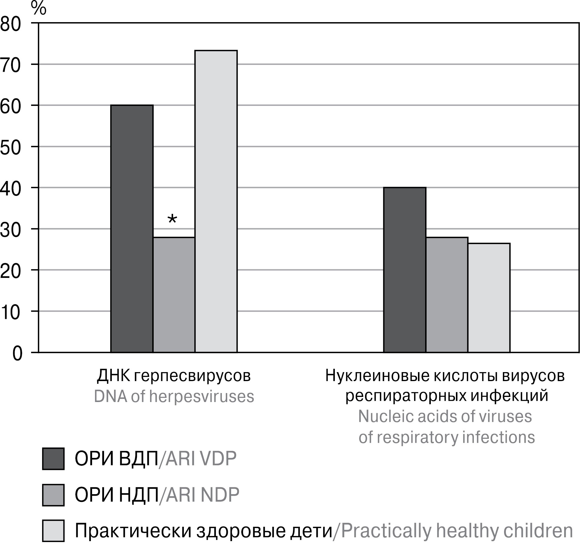 Note. *Significance of differences (р ≤ 0,05) in children with various acute respiratory infection compared with apparently healthy children; **significance of differences (p ≤ 0.05) in in children with ARI of VDP compared with ARI of NDP.