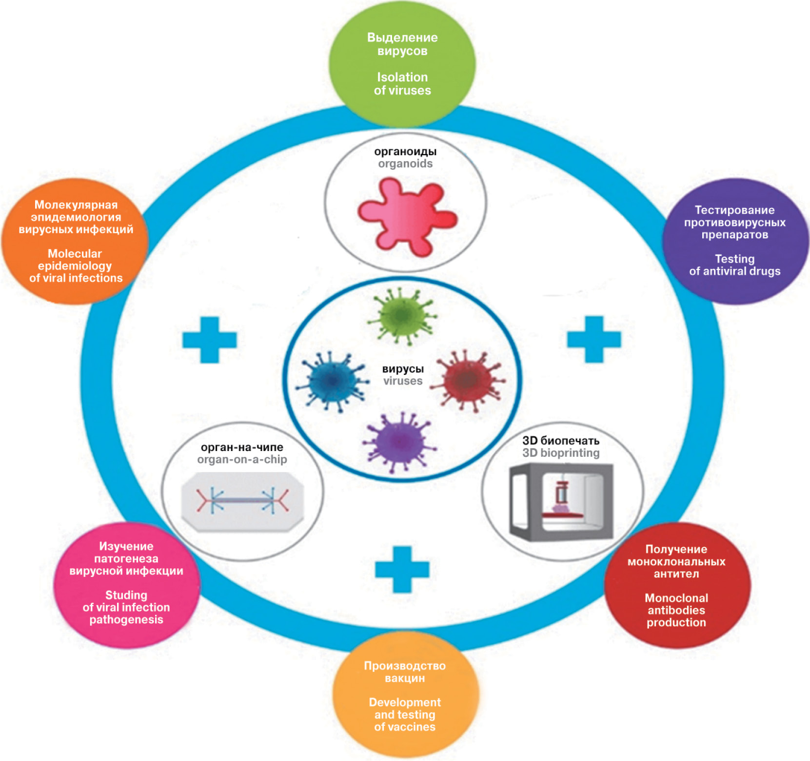 Рисунок. Современные возможности трехмерных (3D) клеточных культур (органоиды, орган-на-чипе, 3D-биопечать) в вирусологии