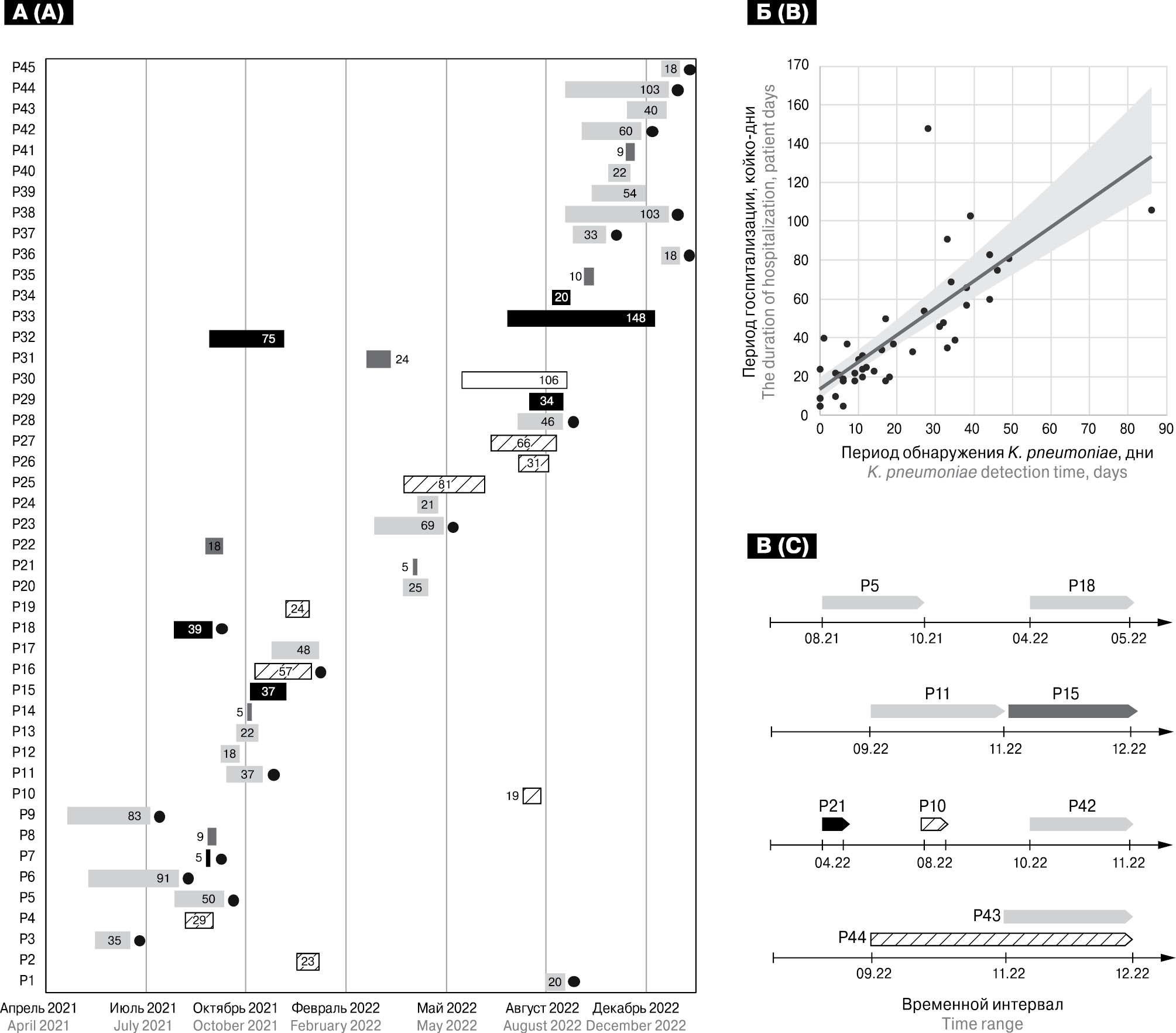 Рисунок. Диаграмма Ганта, показывающая динамику случаев выделения K. pneumoniae от пациентов и продолжительность их пребывания в отделениях кардиохирургического стационара (А), связь между сроком выявления K. pneumoniae и продолжительностью пребывания (Б) и эпидемиологические цепочки циркуляции идентичных штаммов (В). Примечание. Число показывает количество койко-дней. Цвет отражает тип отделения: светло-серый — отделения анестезиологии и реанимации, штриховка — кардиохирургическое отделение № 1, темно-серый — кардиохирургическое отделение № 2, белый — кардиохирургическое отделение № 3, черный — кардиохирургическое отделение № 4. Летальные исходы обозначены черным кружком.
