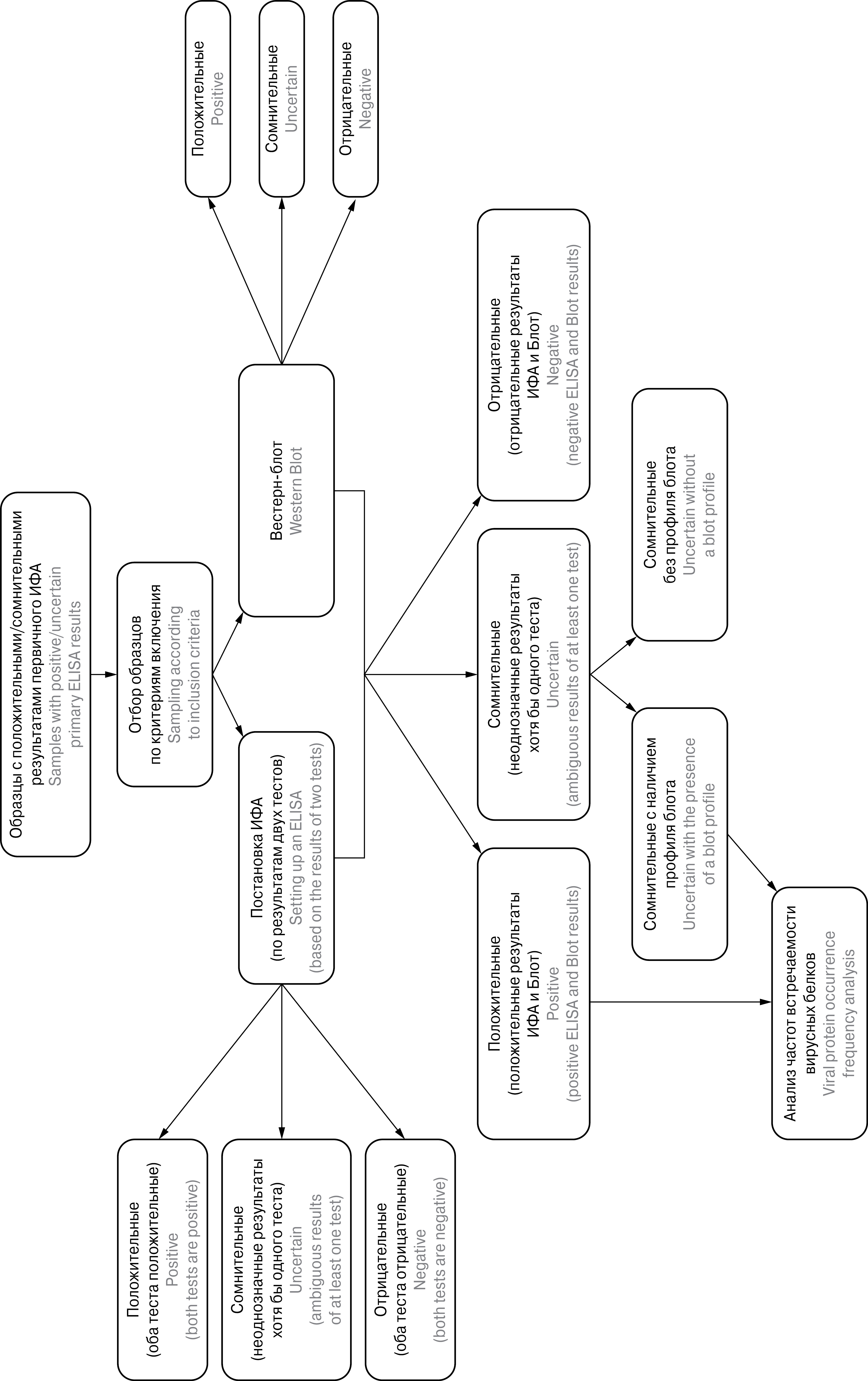 В рамках исследования сыворотки крови определяли наличие Аг/Ат методами ИФА с использованием диагностических наборов «ДС-ИФА-ВИЧ-АГ+АТ» и «МилаЛаб-ИФА-ВИЧ-АГ+АТ» (Диагностические системы, Российская Федерация) и ИХЛА «HIV Ag/Ab Combo» (Abbott Laboratories, Германия). Таким образом, для оценки жизненного цикла вируса и преобладания его отдельных стадий, были выбраны следующие вирусные белки: gp160, gp120, gp41, p55, p40, р24, p17, p66, p51, p31. Выявление антител к индивидуальным белкам ВИЧ осуществляли методом Вестерн-блот, применяя набор реагентов «NEW BLOT BIORAD» (Bio-Rad Laboratories, США), согласно инструкции производителя. Дизайн эксперимента и отбора образцов представлен на рис. 1.