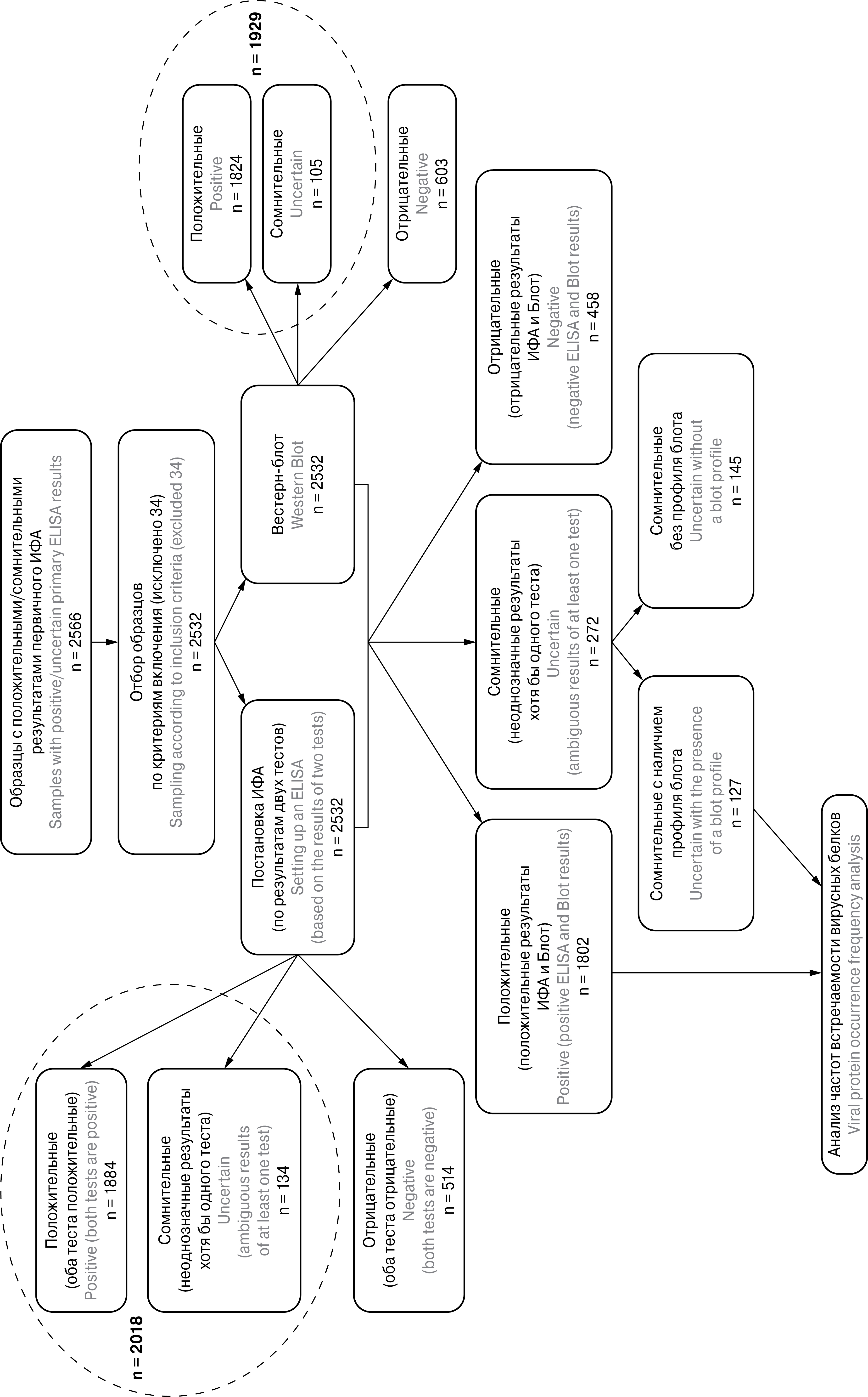 В ходе работы было проанализировано 2566 образцов. Среди полученных образцов 2018 (79,70%, 95% ДИ: 78,08–81,25%) показали неотрицательный результат (положительные и неопределенные) — при перекрестном анализе методами ИФА и ИХЛА. При анализе методом иммуноблоттинга выявлено позитивных лиц 1824 (72,04%, 95% ДИ: 70,25–73,78%) от всей выборки, неопределенных — 105 (4,15%, 95% ДИ: 3,40–5,00%). Положительный результат, согласно всем 3м тестам, был определен у 1802 образца (71,17%, 95% ДИ: 69,36–72,93%) из общей выборки. Указанные образцы были отобраны для дальнейшего анализа. Результаты представлены на рис. 2.