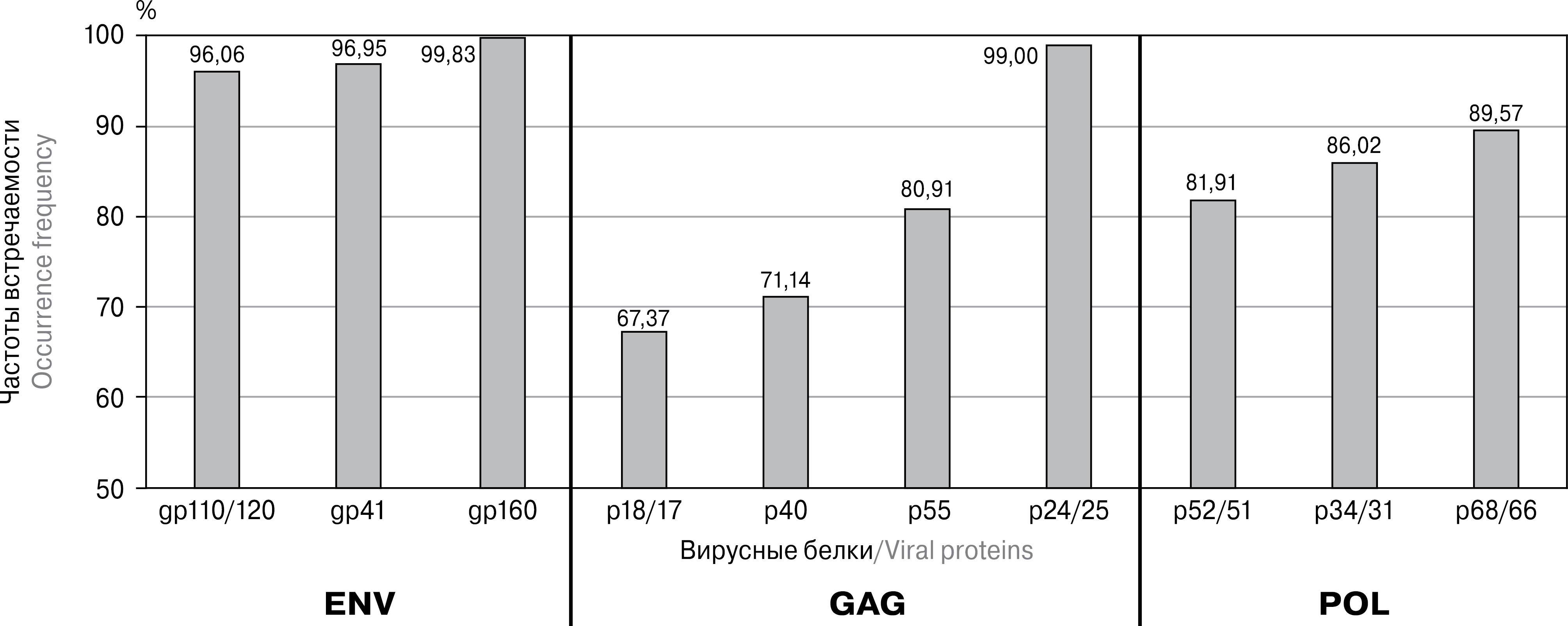 Рисунок 3. Частоты встречаемости белков ВИЧ в обследованной позитивной группе