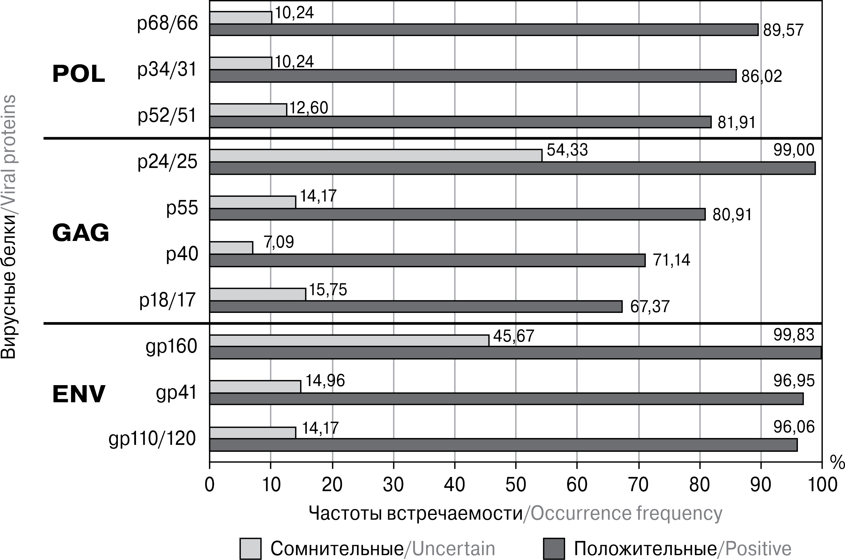 На рис. 3 представлены результаты анализа частотных показателей белков ВИЧ у позитивных лиц.