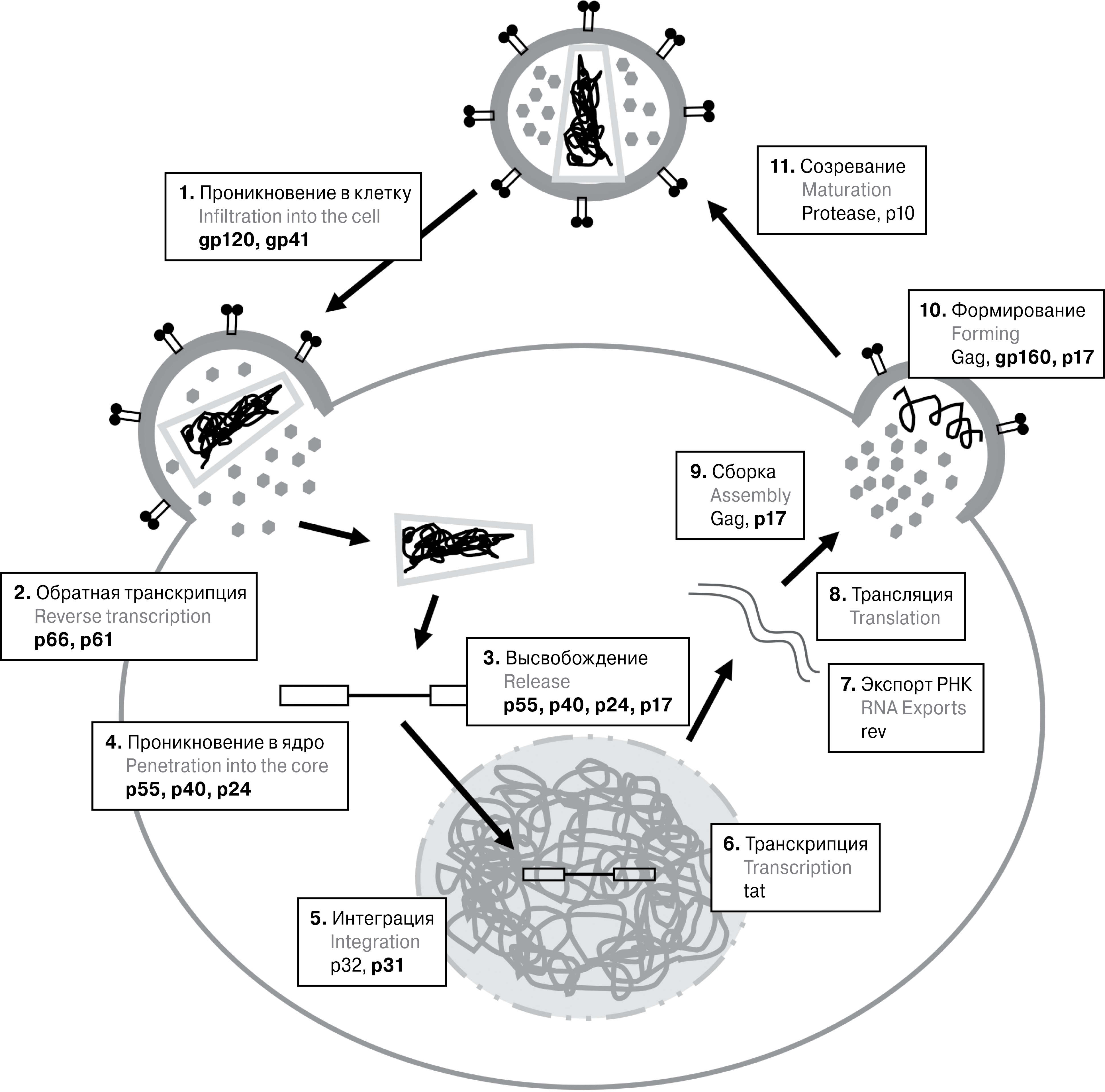 ВИЧ представляет собой РНК-содержащий вирус, геном которого кодирует по крайней мере 15 белков, осуществляющих структурные, ферментативную и регуляторные функции [15]. Жизненный цикл ВИЧ можно разделить на 11 стадий с участием отдельных вирусных белков — проникновение вируса в клетку с непосредственным участием белков gp120 и gp41, кодируемых геном env, который также ответственен за тропизм ВИЧ [5]; этап обратной транскрипции, реализуемый вирусным ферментом обратной транскриптазой, сформированным белками p68/66 и р52/51; этапы вскрытия оболочки и проникновения в ядро с участием вирусного белка р24; интеграция провируса в ДНК клетки посредством интегразы, формируемой белком р31; транскрипция ДНК в РНК, в которой значительную роль играют продукты вирусного гена tat; экспорт РНК продуктами гена rev; трансляция; сборка вирусных частиц и их высвобождение из клетки продуктами гена gag; «созревание» вирусных частиц (р10, p6) [8, 9]. Преобладание или отсутствие тех или иных белков дает информацию о протекании/преобладании отдельных стадий развития вируса. Отсутствие или дефект какого-либо вирусного белка существенно сказывается на формировании новых вирусных частиц. Так, например, последовательности GagPol, лишенные области, кодирующей белок p6, могут быть включены в нуклеотидные последовательности созревающих частиц ВИЧ, но в дальнейшем отсутствие белка p6 негативно влияет на димеризацию протеазы, таким образом нарушая созревание вирусных частиц [12].