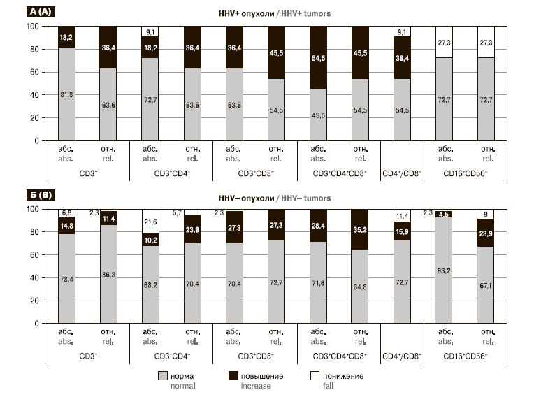 У пациентов с HHV+ опухолями обнаружены характерные качественные и количественные сдвиги в составе лимфоцитов периферической крови, которые затрагивали преимущественно популяции Т- и NK-клеток: