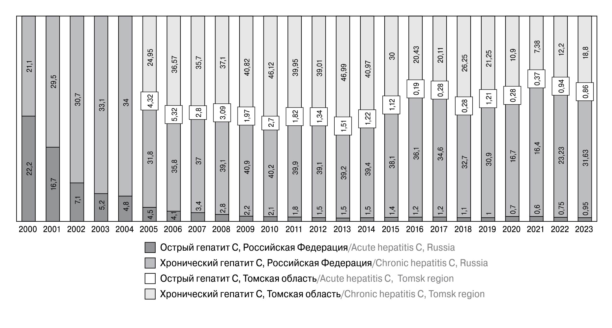 Учитывая, что пациенты с ВГС-инфекцией подвержены риску прогрессирования заболеваний печени и представляют угрозу для дальнейшей передачи вируса, с клинической точки зрения крайне важно своевременное выявление лиц с ВГС во избежание распространения инфекции, а также проведение статистического анализа выявленных случаев с целью отслеживания эпидемиологической ситуации, связанной с инфекцией ВГС [13]. Несмотря на большие успехи, достигнутые в области вирусологии и диагностики вирусных инфекций, ряд трудностей влияют на прогресс в борьбе с инфекцией, вызванной ВГС, и на его элиминацию в настоящее время. Новые случаи инфицирования ВГС по-прежнему происходят во всем мире, особенно в некоторых отдаленных регионах, где ГС является эпидемиологически опасным заболеванием, в том числе в г. Томске и Томской области (ТО). Для более эффективной элиминации ВГС необходим комплексный подход по разработке плана и стратегии борьбы с ВГС-инфекцией на мировом и местном уровнях. При разработке данного плана и осуществлении контроля за качеством лабораторной диагностики, регистрации и учета случаев заболеваний гепатитами, а также охвата больных эффективным лечением, целесообразно внедрение Регистра больных вирусными гепатитами на территориях всех субъектов Российской Федерации, в том числе г. Томска и Томской области. Целью исследования был анализ эпидемиологической ситуации в отношении острых и хронических форм ВГС-инфекции у взрослых и детей за период 2022–2023 г. и характеристика структуры заболеваемости в Томской области.