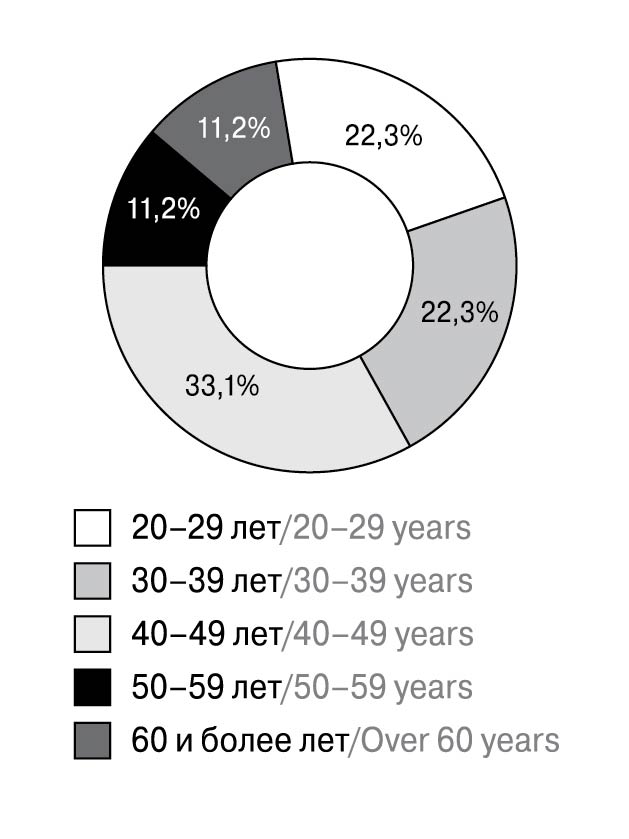 Структура заболеваемости в разных возрастных группах за 2023 год выглядит следующим образом: 40–49 лет — 33,1%, 20–29 лет и 30–39 лет — по 22,3%, 50–59 лет — 11,2% и в группе 60 лет и старше — 11,1% (рис. 2). Сравнивая с предыдущими годами, можно отметить изменения в распределении больных. Например, в 2022 г. больше всего заболевших было в возрастной группе 30–39 лет, что составило 30% в общей популяции, затем по 20% приходилось на возрастные категории 20–29 лет и 50–59 лет, и по 10% — на детей до 1 года, а также на лиц 60 лет и старше. В 2021 г. одинаковое количество заболевших было среди групп 20–29 лет и в группе 60 лет и старше. Среди детей в возрасте до 1 года также отмечалась заболеваемость ОГС. Заболеваемость ОГС в 100% случаев регистрировалась среди взрослого населения в 2023 г. и не регистрировалась у детей, при инфицировании которых одним из главных путей заражения является вертикальный — с трансплацентарным, интранатальным и постнатальным инфицированием ребенка от матери. Данные показатели свидетельствуют о тенденции к распространению инфицирования ВГС во всех возрастных группах с повышением возрастной границы.