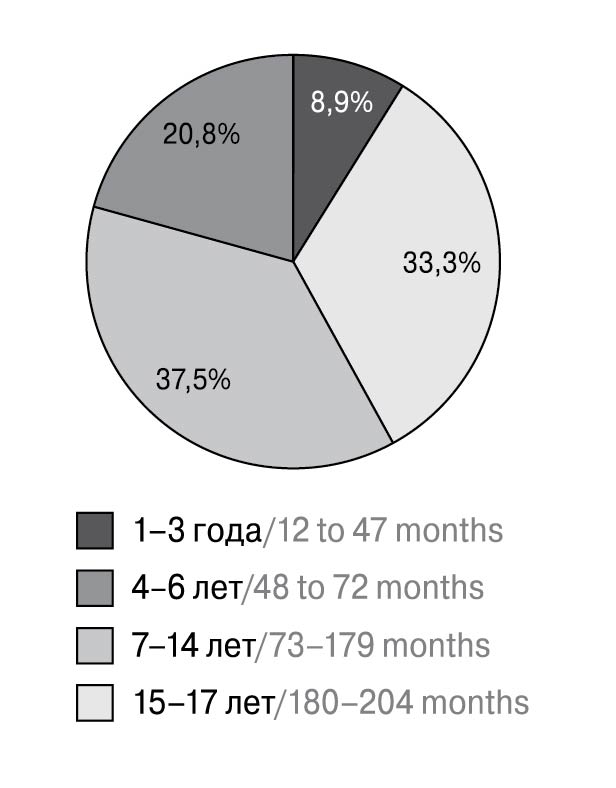 В 2023 г. с диагнозом ХГС состояло 28 детей до 17 лет, что составляет 11,2 случая на 100 тыс. детского населения. Наибольший удельный вес ХГС приходится на возрастную группу с 14 до 17 лет (35%). Анализ распределения по полу показал превалировали мальчиков (66,7%) против девочек (33,4%). В 2023 г. в Томской области было выявлено 6 впервые установленных случаев инфекционного гепатита С, при этом из них 4 случая приходится на долю мальчиков. Распределение инфицирования ВГС в популяции детей на территории Томской области (0–17 лет) выглядит следующим образом: в возрастной группе от 1 до 3 лет составило — 8,9% (n = 2), от 4 до 6 лет — 33,3% (n = 8), от 7 до 14 лет — 37,5% (n = 9), от 15 до 17 — 20,8% (n = 5). Значительную долю среди пациентов, состоящих на диспансерном учете, составляют дети в возрасте от 7 до 14 лет (37,5%) (рис. 3). У 75% детей диагноз хронического вирусного гепатита С впервые установлен в возрасте от 0 до 3 лет — 75% (n = 18).