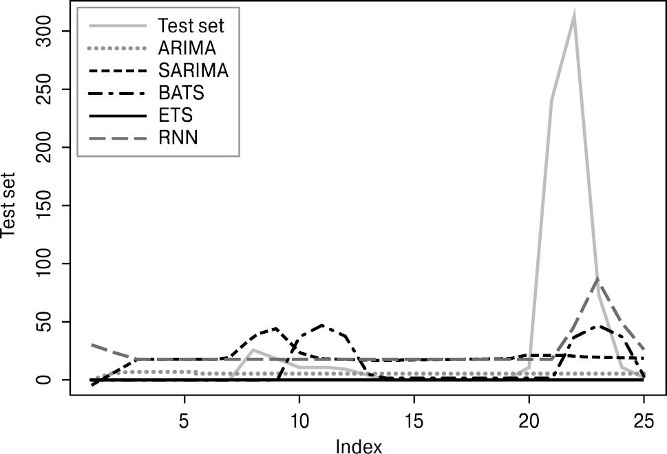 ETS had the worst performance. We applied simple exponential smoothing but could not use multiplicative errors and seasonal components due to negative values. Similarly, the additive case also resulted in negative values.
