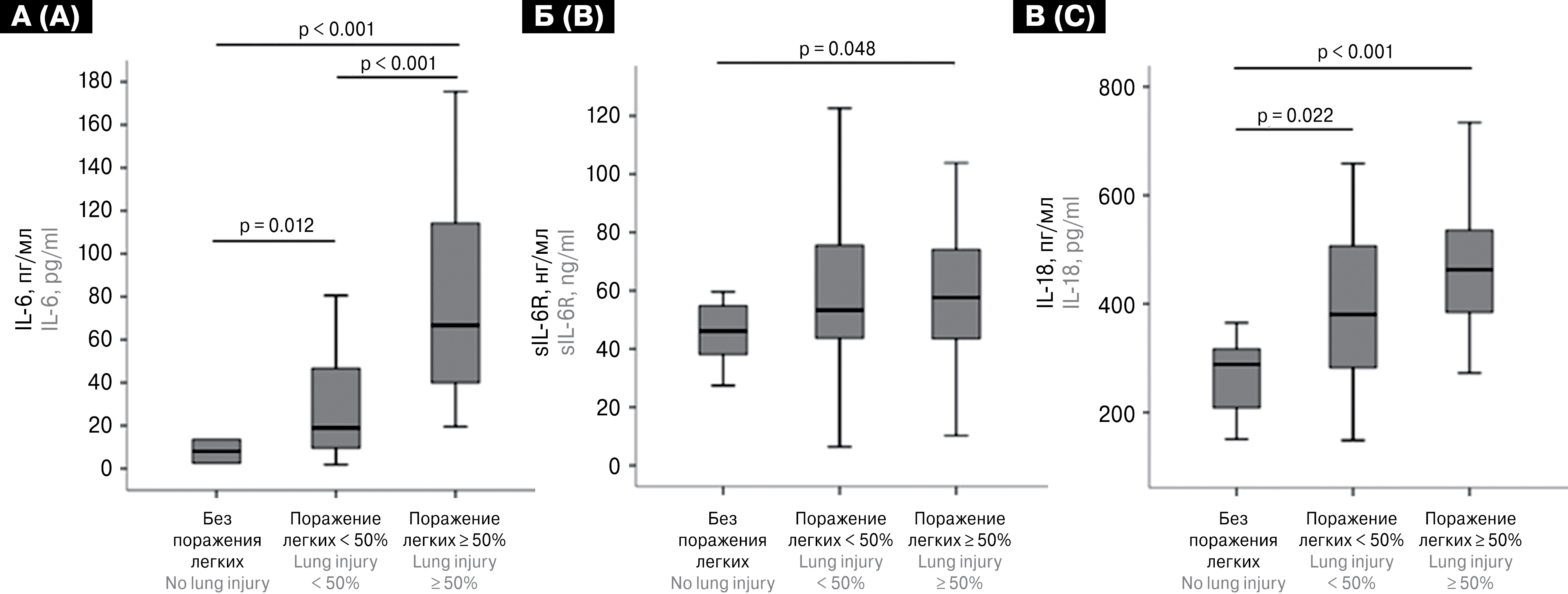Рисунок 1. Уровни IL-6 (А), sIL-6R (Б) и IL-18 (В) в зависимости от тяжести COVID-19