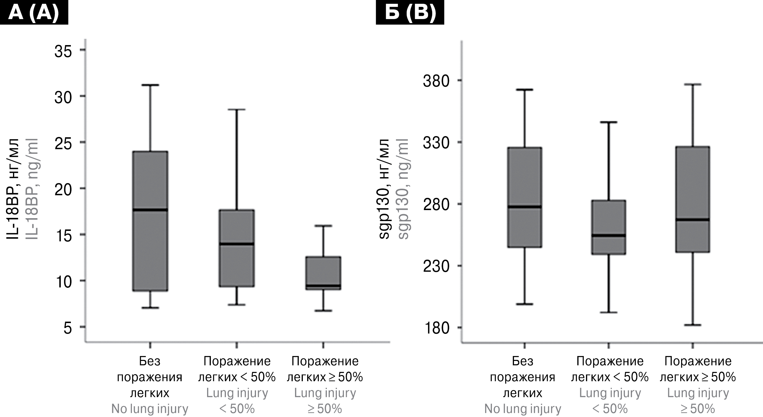 Рисунок 2. Уровни IL-18BP (А) и sgp130 (Б) в зависимости от тяжести COVID-19
