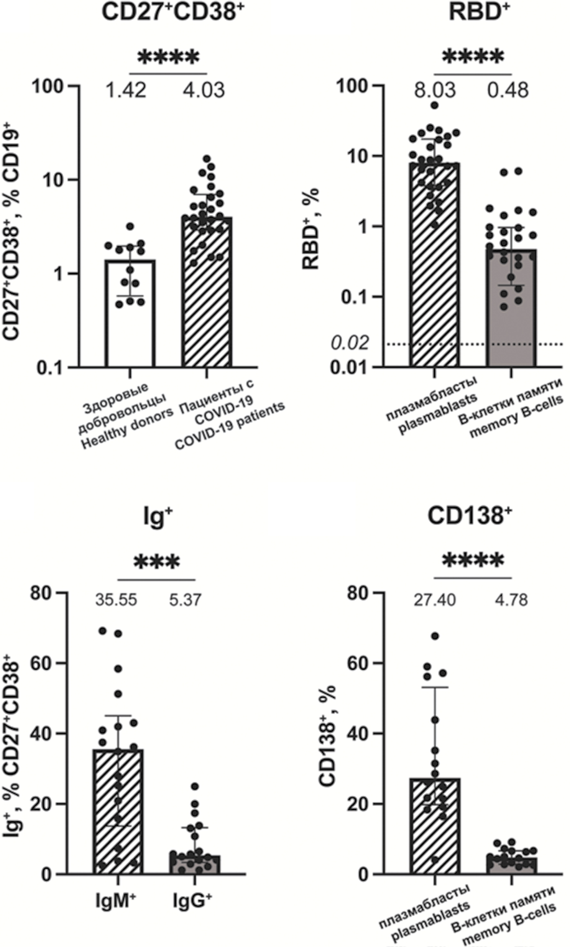 Для сравнения приведены данные из группы здоровых доноров (слева). Б — доля RBD-специфических В-клеток в популяциях плазмабластов (слева) и В-клеток памяти (справа). Пунктирной линией обозначен базовый уровень у здоровых доноров. В — доля клеток, экспрессирующих поверхностный IgM (слева) или IgG (справа), в популяции плазмабластов. Г — доля CD138+ клеток в популяциях плазмабластов (слева) и В-клеток памяти (справа). Цифрами указаны медианы% позитивных клеток. *** — p < 0,001, **** — p < 0, 0001.