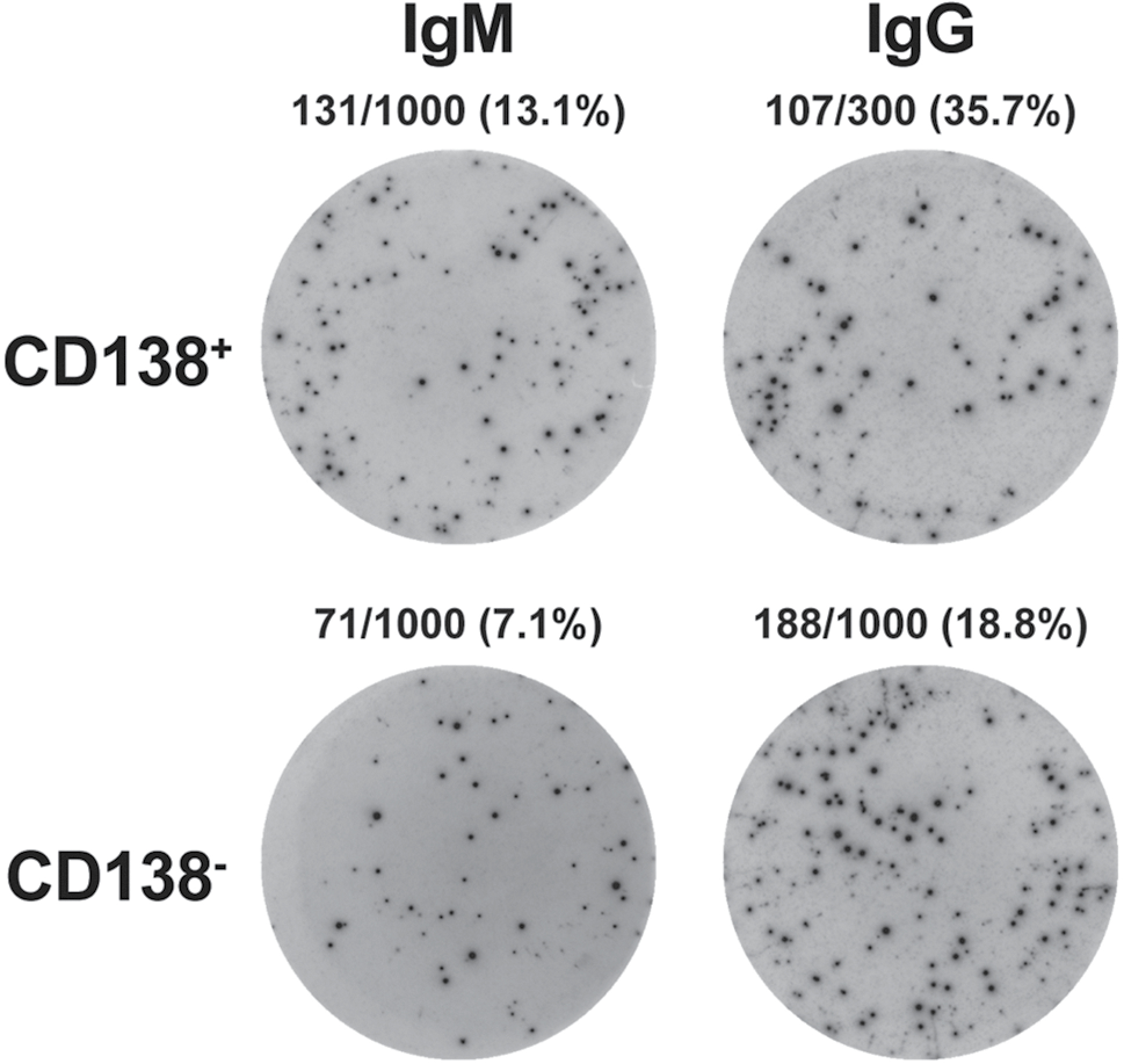 Figure 2. Representative ELISpot showing cells secreting IgM (left) or IgG antibodies (right) in the CD138⁺ (top row) and CD138– (bottom row) plasmablast populations.