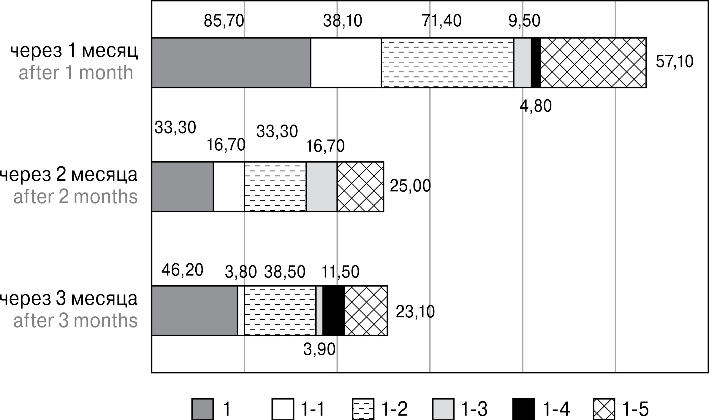 Изучение данных в сроки 1, 2 и 3 месяца после верификации COVID-19 позволило установить, что не было различий в проявлении постковидного синдрома в зависимости от тяжести инфекции. В частности, частота случаев тяжелого течения COVID-19 в структуре наблюдений через 1 месяц составила 14,3%, через 2 месяца — 16,7%, через 3 месяца — 15,4%. Как среднетяжелое течение перенесенного заболевания оценили через 1 месяц после инфицирования 52,4% респондентов, через 2 месяца после инфекции — 33,3% участников и через 3 месяца после заражения — 46,2% человек. Частота случаев легкого течения заболевания в структуре исследований через 1 месяц после болезни составила 33,3%, через 2 месяца — 50,0% случаев, через 3 месяца — 26,9% эпизодов. Среди наблюдений в группе № 3 оказалось 3 (11,5% от числа в группе) участников, которые перенесли инфекцию бессимптомно, из них у одного жалобы на утомляемость после подтвержденного эпизода инфицирования COVID-19 тем не менее присутствовали.