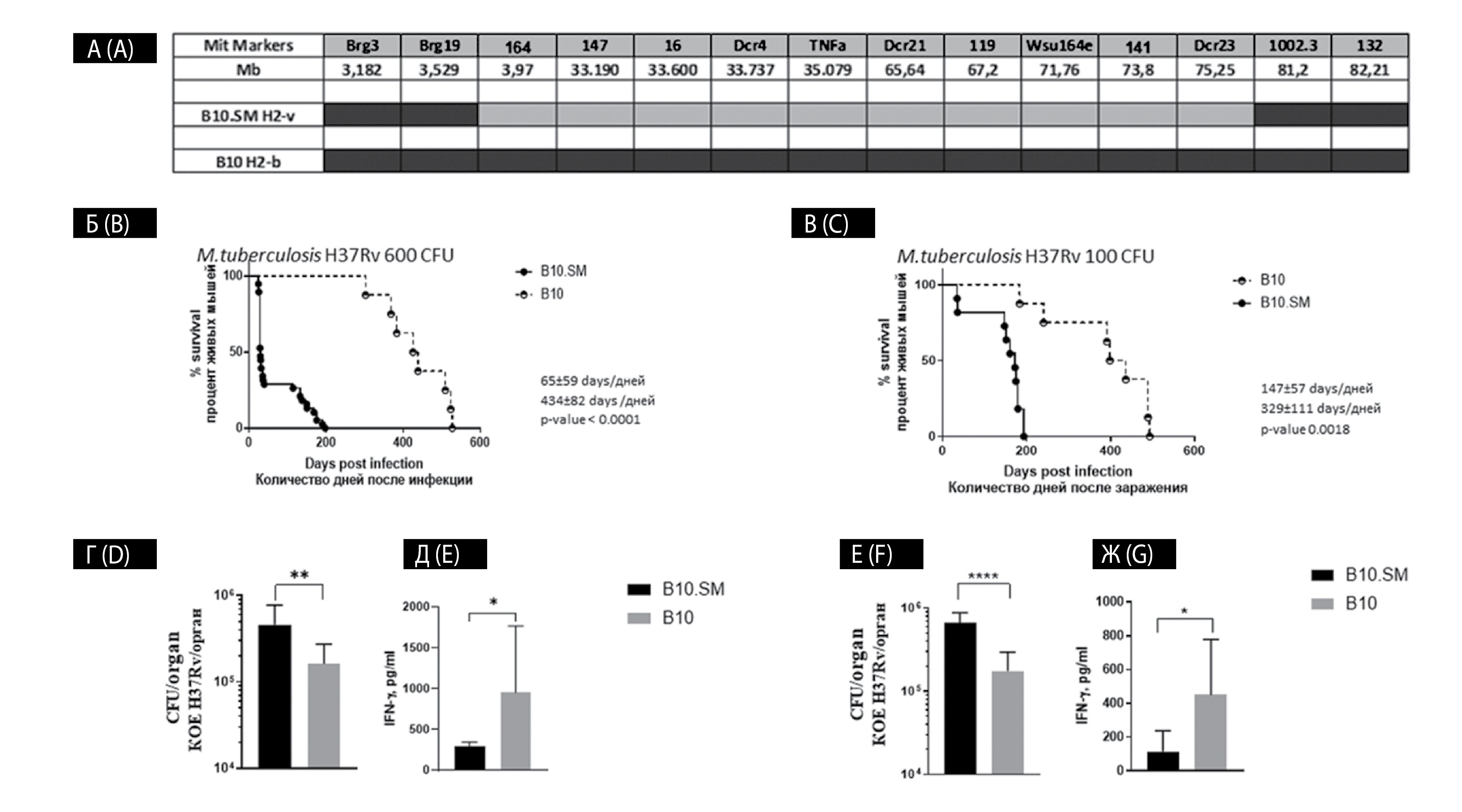 Note. (A) Mice B10.SM carry region of H2ᵛ (gray color) haplotype on H2ᵇ background (black color) of 17 chromosome determined using PCR analysis with Mit markers. Survival curves of strains B10.SM and B10 after aerosol Mtb infection with dose of 600 (B) and 100 (C) CFU. Reproduction of Mtb in the lungs after high (D) and low (F) dose infection. Production of IFNγ by lung cells of mice infected with a high (E) and low (G) dose of the pathogen after stimulation in vitro with Mtb poly-antigen. *, **, **** = p < 0.05, p < 0.01 and p < 0.0001, respectively.