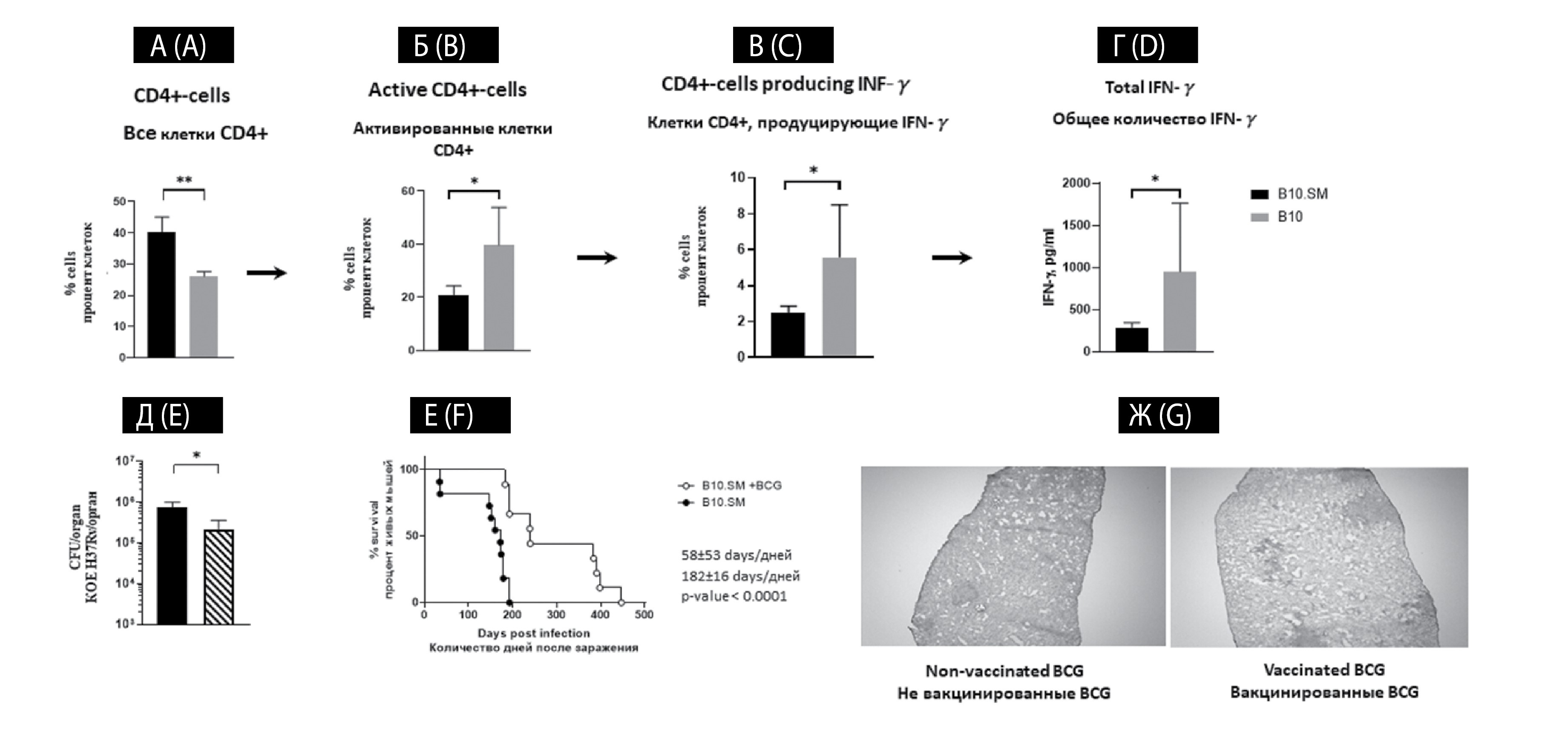 Примечание. Общий процент (А), доля активированных (Б) количество продуцентов IFNγ среди Т-клеток CD4⁺ (В) и общая секреция всеми клетками легких IFNγ in vitro (Г) после заражения туберкулезом. (Д) — количество Mtb в легких у мышей после вакцинации и последующего заражения H37Rv в дозе 600 КОЕ/мышь; (Е) — кривая выживаемости мышей после вакцинации и последующего заражения; (Ж) — патология легких у вакцинированных и невакцинированных животных после заражения, окрашивание гематоксилином-эозином, увеличение ×25.