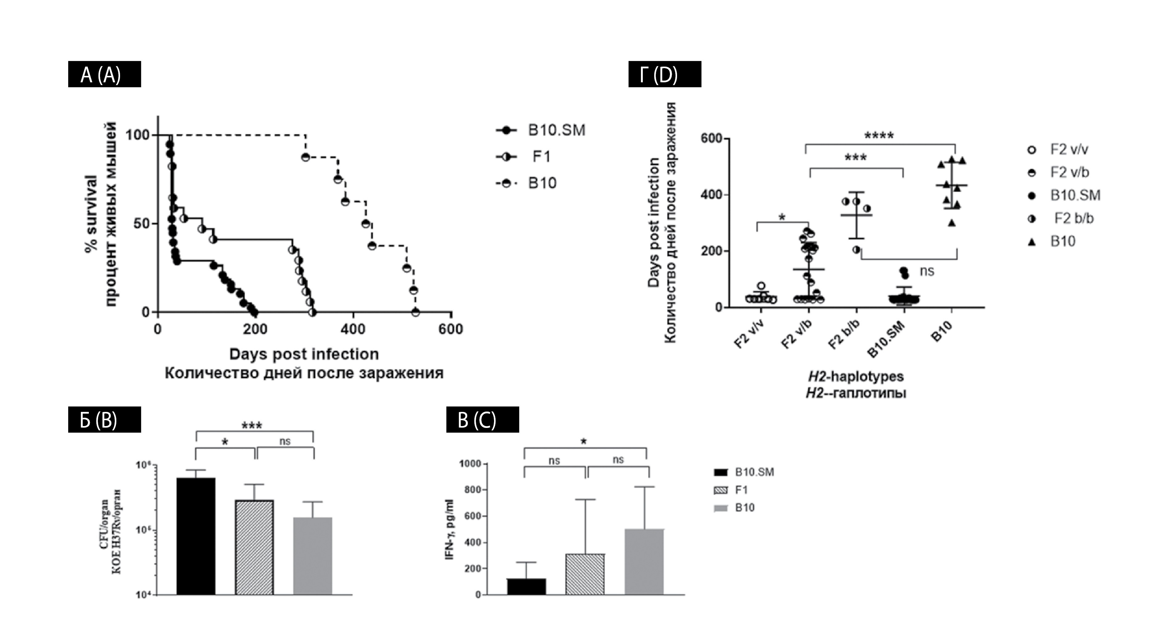 Примечание. (А) — кривые выживания после заражения дозой 600 КОЕ/мышь. (Б) — Размножение Mtb в легких. (В) — Специфическая продукция IFNγ клетками легких. (Г) — картина неполного доминирования при сегрегационном генетическом анализе гибридов F2.