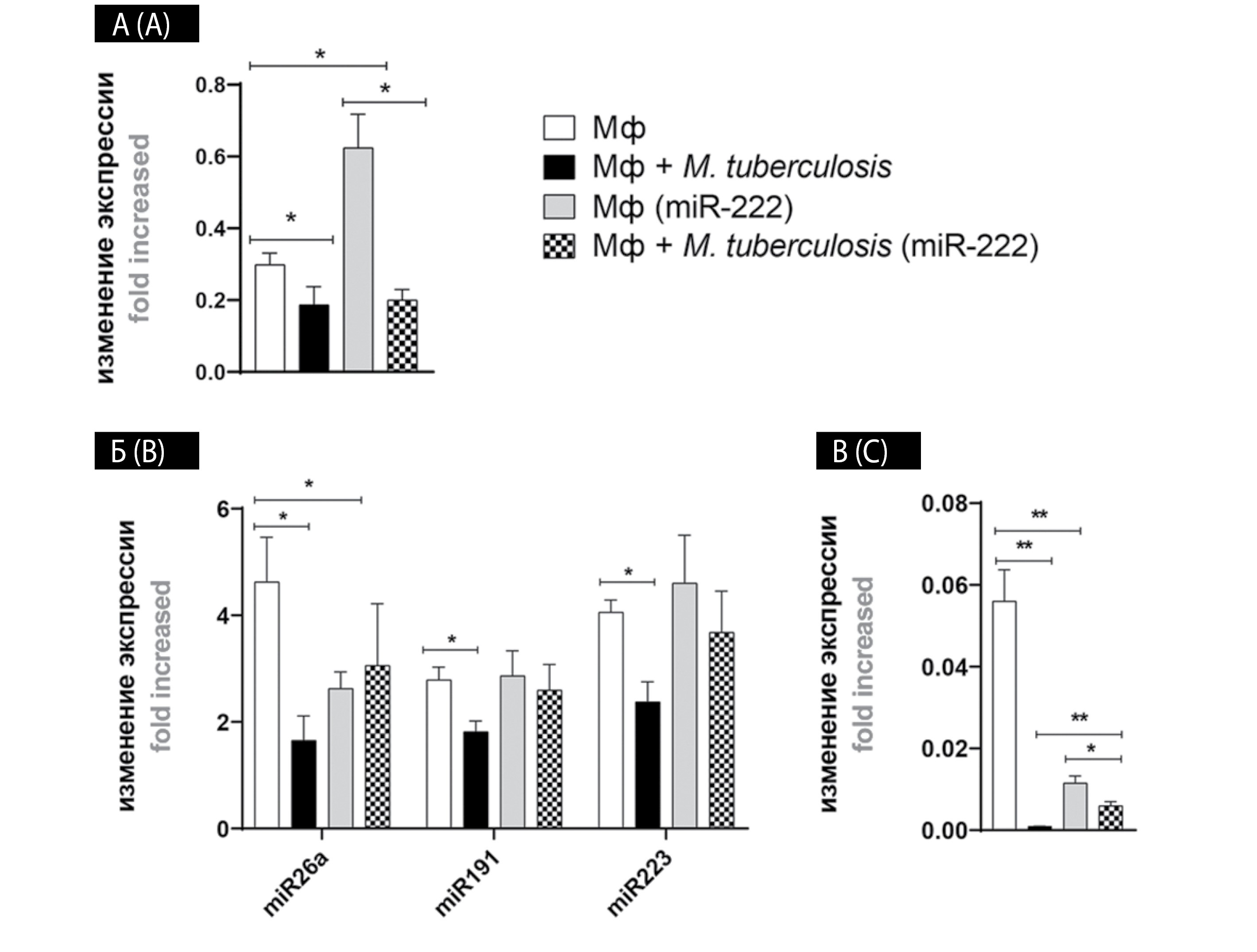 Для получения макрофагальной культуры с гиперэкспрессией miR-222, Мф, «воспитанные» из моноцитов крови, подвергали трансфекции синтетическим аналогом hsa-miR-222. Через 72 часа клетки отмывали от среды трансфицирования и культивировали 24 часа в присутствии либо в отсутствии сониката микобактерий. Из рис. 1А видно, что наличие микобактериальных антигенов в культуре неинфицированных Мф вело к достоверному снижению экспрессии miR-222. Обработка «наивных» макрофагов синтетическим аналогом miR-222 приводила к достоверному усилению экспрессии данной miR. В то время как наличие микобактериальных антигенов в культуре отменяло эффект гиперэкспрессии miR-222. Отрицательным контролем в экспериментах in vitro являлись культуры макрофагов человека, обработанные трансфицирующим агентом без РНК и смесью трансфицирующего агента с NC. Достоверных отличий между культурами «наивных» Мф (без трансфекции) и культурами отрицательного контроля в экспериментах in vitro получено не было.