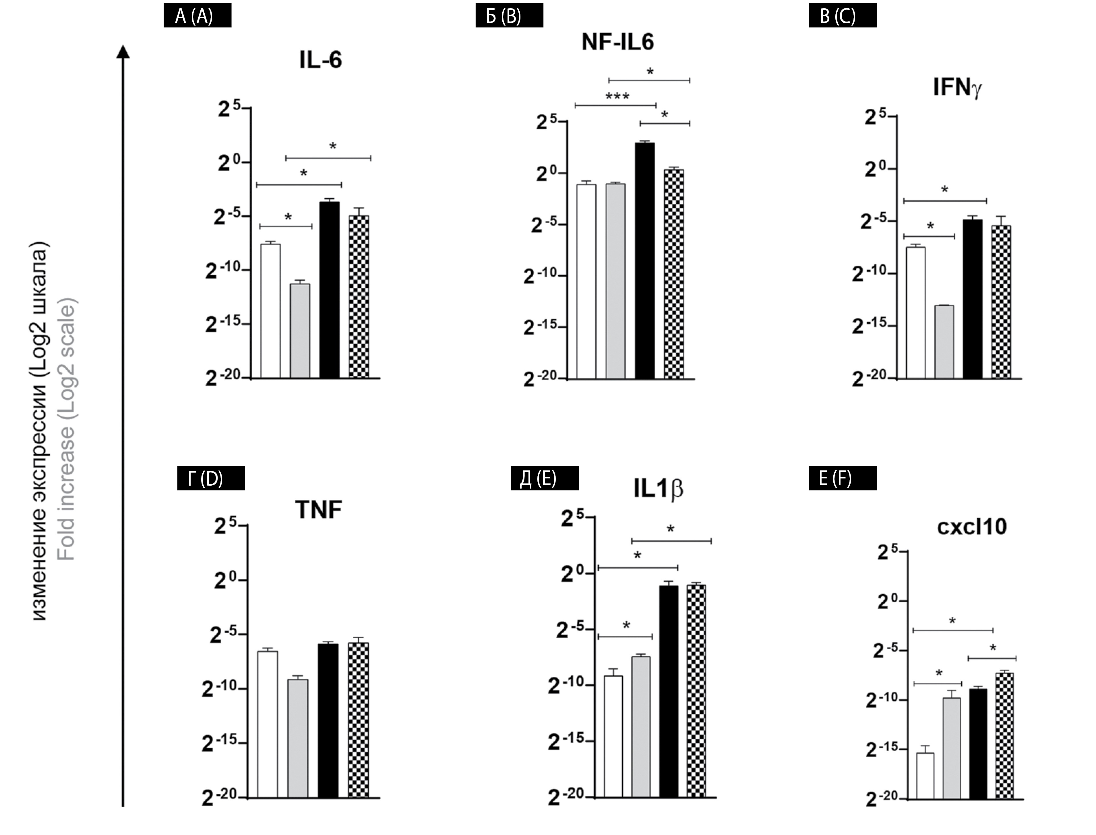 ПЦР в реальном времени. qRT-PCR с кДНК проводили с использованием системы CFX96 Real-Time System (Bio-Rad, США), специфических праймеров, зондов TaqMan и реагентов ThermoFisher Scientific (Applied Biosystems, США) для определения уровней мРНК генов, связанных с воспалением. GAPDH использовался в качестве гена домашнего хозяйства.