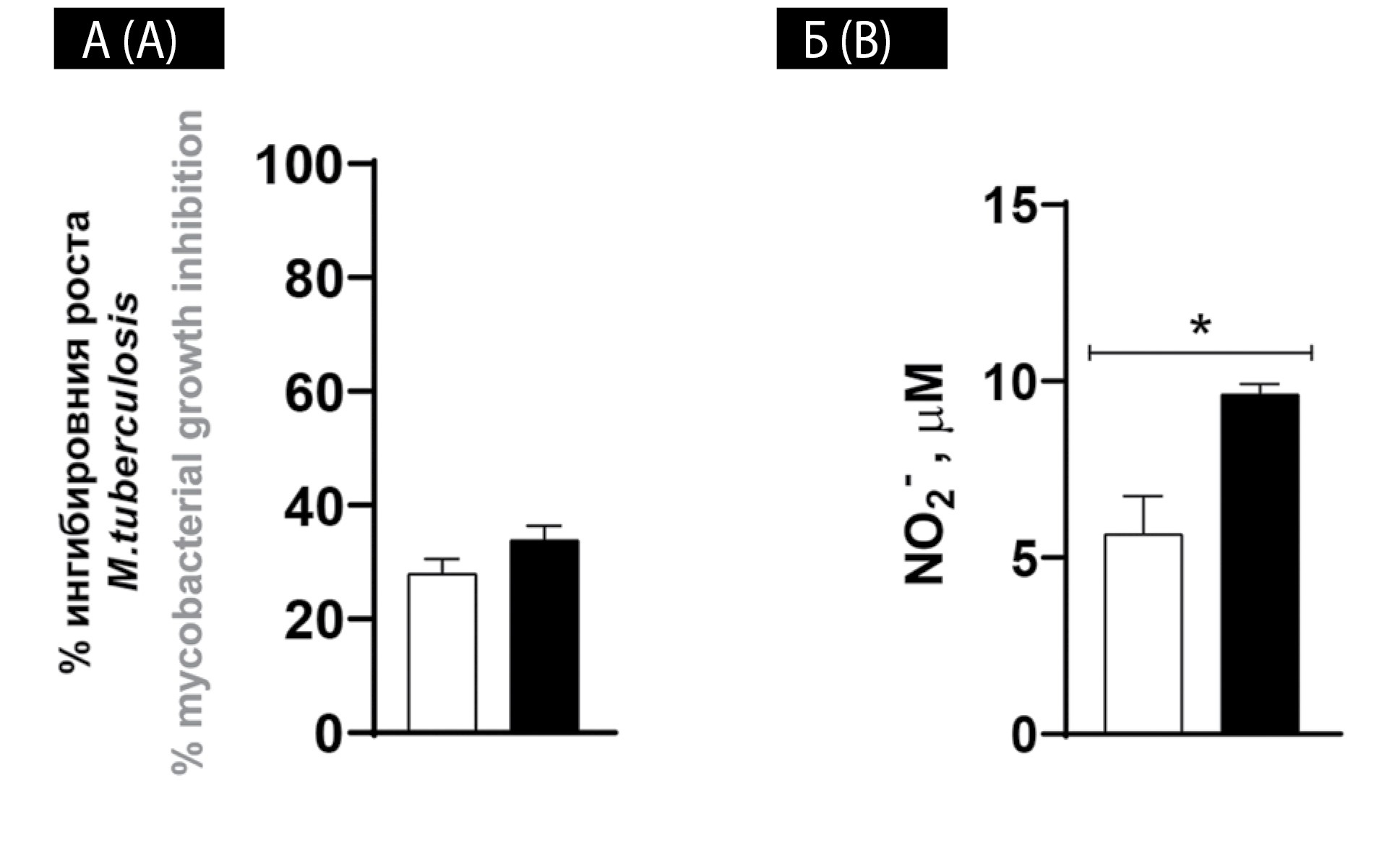 Определение бактериостатической функции макрофагов. Бактериостатическую функцию макрофагов оценивали методом регистрации включения [3H]-урацила микобактериями при совместном культивировании с макрофагами по ранее описанной методике [1]. Подавление роста микобактерий в культурах Мф представляли в процентах от включения [3H]-урацила микобактериями в культурах без Мф. Продукцию активных форм азота макрофагами при их совместном культивировании с микобактериями определяли по концентрации нитрит-аниона с использованием реактива Грисса [1].