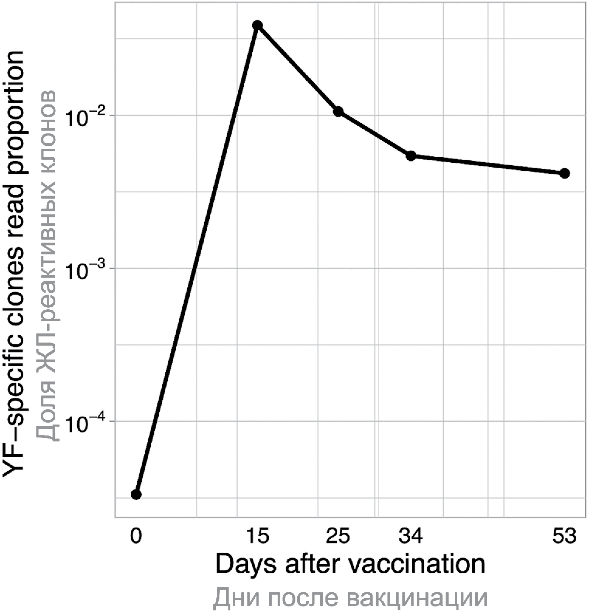 Рисунок 1. Динамика Т-клеточного ответа на вакцинацию YF17D. Доля ЖЛ-специфических TCRb клонов от всего репертуара в различных точках до и после вакцинации