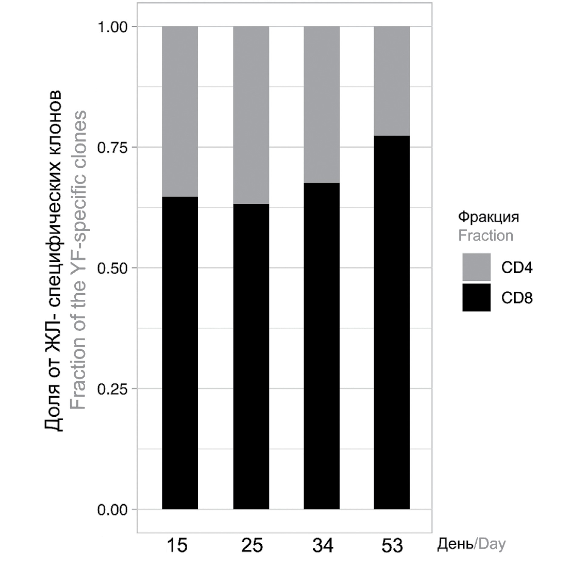 В данной работе мы подробно рассмотрели динамику и клональный состав Т-клеточного ответа на вакцинацию от желтой лихорадки донора с нераспространенным HLA генотипом. Общая динамика ответа была схожей с опубликованными данными, на 15 день после вакцинации мы смогли детектировать 584 ЖЛ-специфических клона, которые составляли 3,9% от всего репертуара TCRb. Интересно, что несмотря на отсутствие известного иммуногенного эпитопа для HLA I класса у данного донора, среди отвечающих клонов преобладали CD8⁺ Т-клетки, увеличившие свою долю к 53 дню. Однако, аминокислотные кластеры CDR3 были образованы в большей части CD4⁺ Т-клетками, самый большой кластер был нами охарактеризован и сохранялся до 53 дня. Таким образом, были показаны важные отличия в Т-клеточном ответе, связанные с набором HLA аллелей.