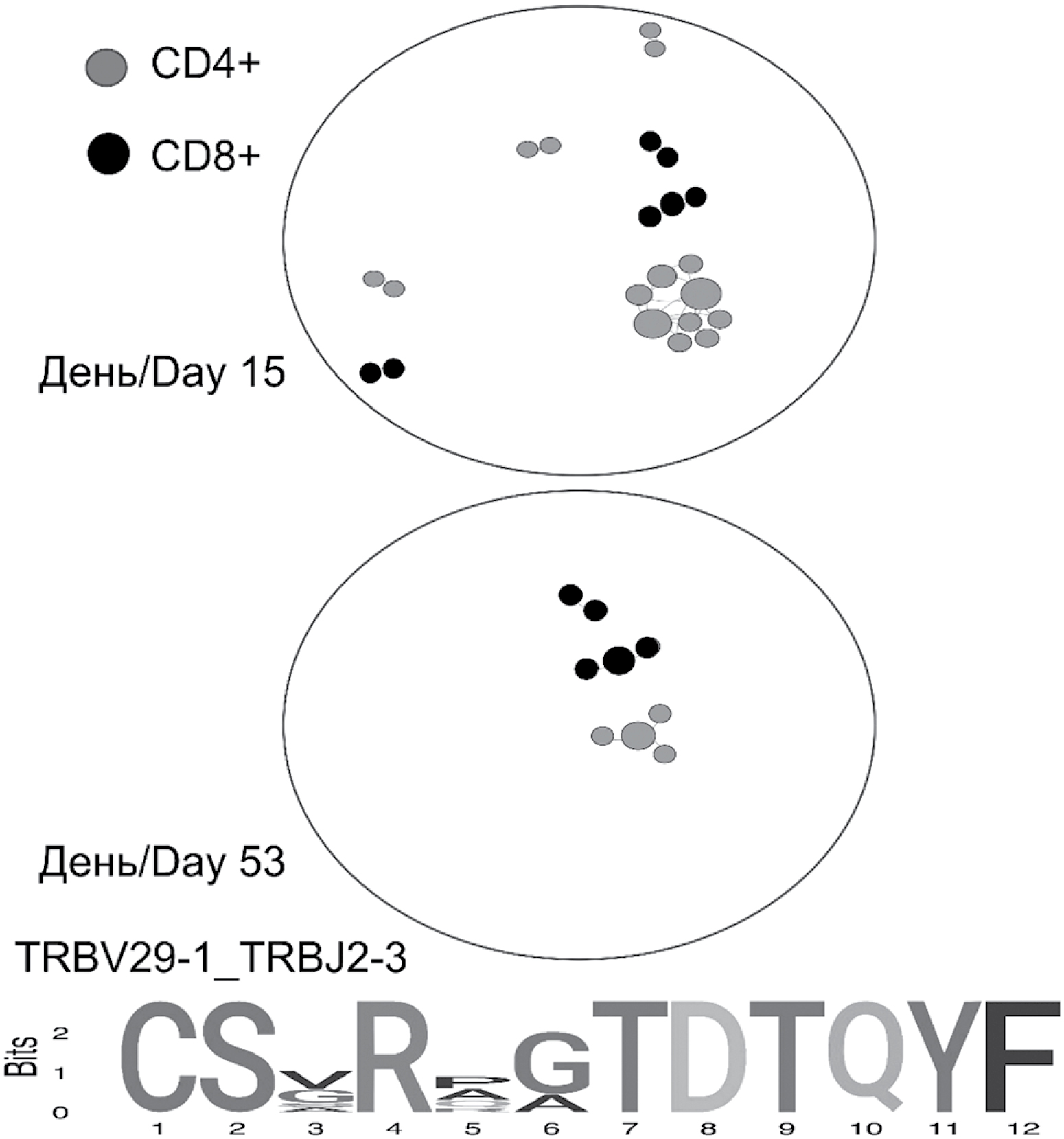 Несмотря на отсутствие известного иммуногенного эпитопа для данного набора HLA I класса, мы оценили схожесть аминокислотных последовательностей CDR3 TCRb отвечающих клонов с помощью граф анализа (рис. 3). ЖЛ-специфические клоны данного донора образуют меньше кластеров, чем клоны HLA-A02 положительных доноров [7], при этом большинство кластеров образовано CD4⁺ Т-клетками. Клоны из самого большого CD4⁺ кластера сохранялись до 53 дня после вакцинации, что может указывать на наличие иммуногенного вирусного эпитопа, представленного на HLA II класса.