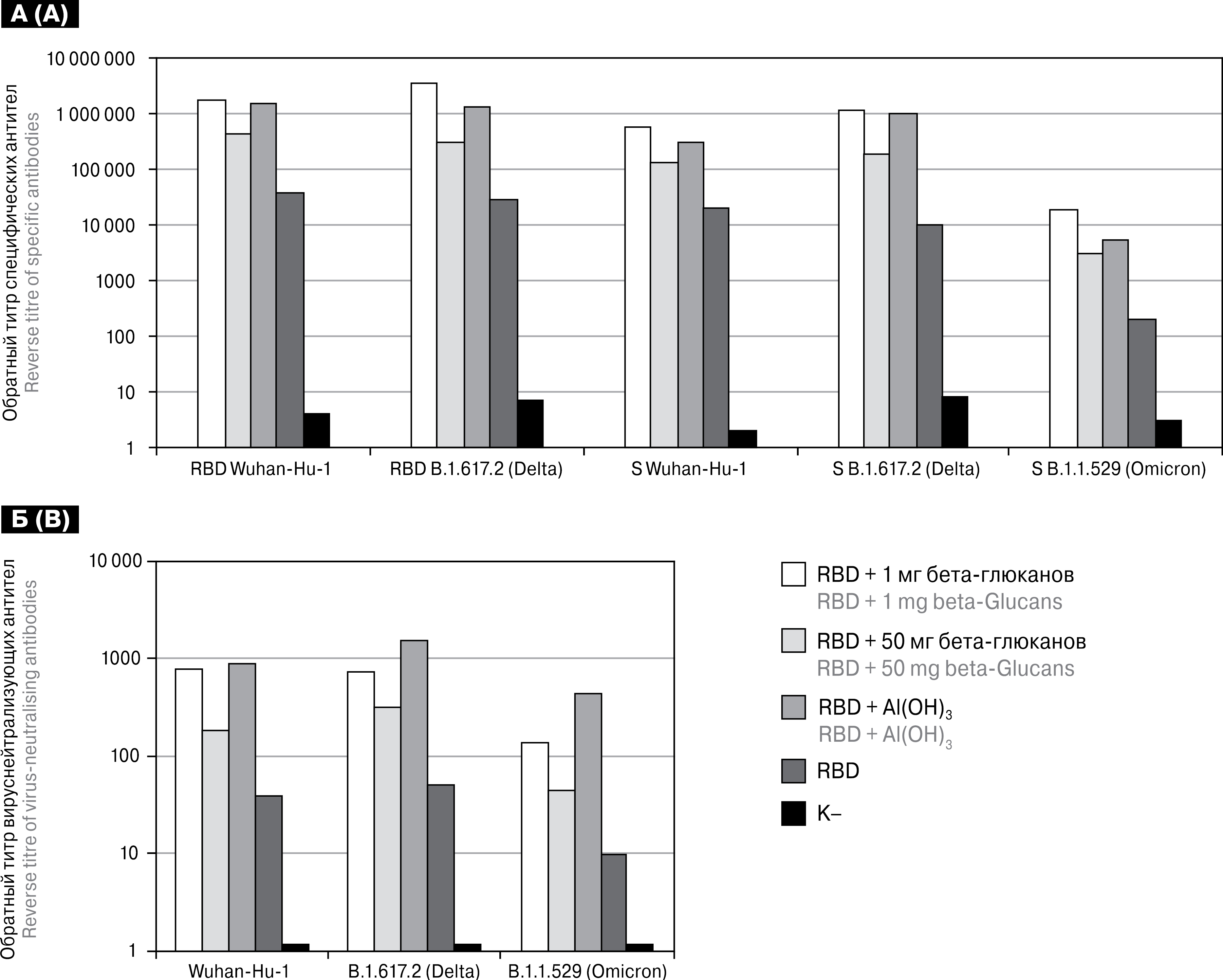 Оценка адъювантной активности препарата бета-глюканов на лабораторных мышах, иммунизированных белком RBD, показала, что бета-глюканы обладают способностью усиливать выработку специфических и вируснейтрализующих антител. В группе мышей, которым вводили адъювант в дозе 50 мкг, средний обратный титр специфических антител против гомологичного антигена (RBD, вариант Delta) составлял 178 740. В группе, получившей адъювант в дозе 1 мг, этот показатель был на порядок выше и составил 1 115 370. Полученные значения среднего обратного титра антител животных опытных групп близки к значениям параметра в группе, иммунизированной RBD с Al(OH)₃ (рис., А), при этом для дозы 1 мг они были несколько выше. Сходную картину наблюдали при тестировании сывороток с использованием RBD гетерологичного варианта Wuhan-Hu-1. Картина значительно не изменялась и при тестировании с использованием полноразмерных S-белков SARS-CoV-2, хотя в случае варианта Omicron наблюдалось снижение обратных титров в опытных группах мышей.