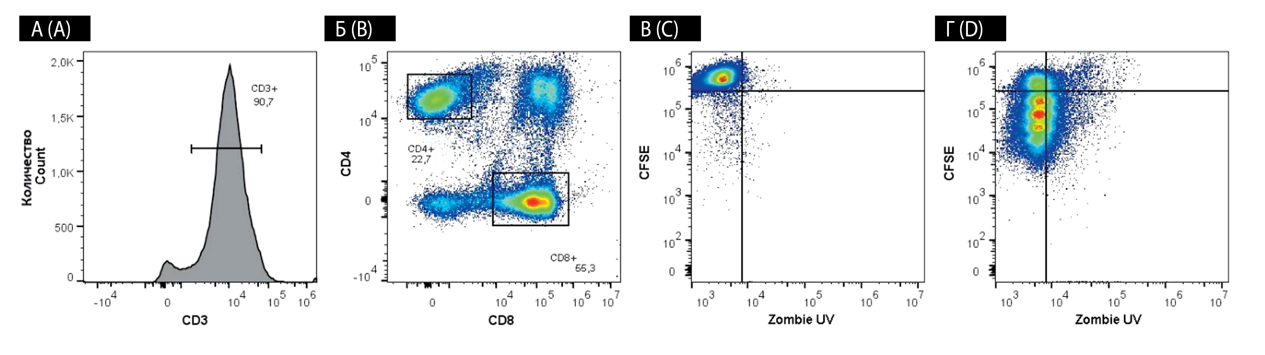 Примечание. А — выделение CD3⁺ Т-клеток; Б — разделение Т-клеток на субпопуляции CD4⁺ и CD8⁺ Т-лимфоцитов; В — установка гейта в нестимулированном образце; Г — анализ единовременного окрашивания витальным красителем Zombie UV и трекинговым красителем CFSE стимулированного образца. Представлены типовые диаграммы светорассеяния.