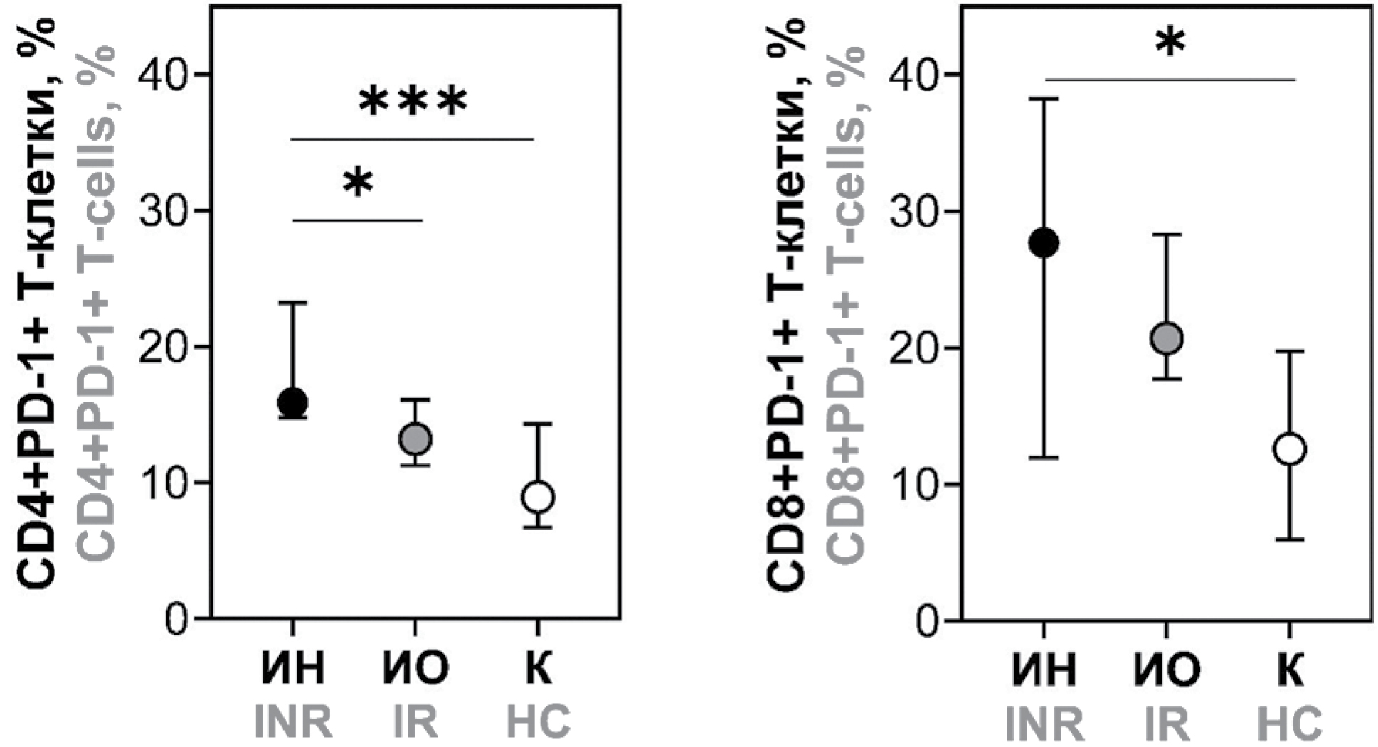 Фенотипический анализ лейкоцитов ex vivo показал следующее (рис. 2). При ВИЧ/ВГС коинфекции в крови пациентов повышается относительное количество CD4⁺ и CD8⁺ Т-клеток, экспрессирующих ингибиторные рецепторы PD-1. Величина пула PD-1-позитивных Т-лимфоцитов зависит от эффективности иммунологического ответа больных на АРТ: наиболее высокое процентное содержание CD4⁺ и CD8⁺ Т-клеток, экспрессирующих PD-1, было выявлено в группе ИН. Поверхностную экспрессию молекулы PD-1 принято считать одним из ключевых маркеров истощения Т-лимфоцитов, которое ассоциировано с прогрессирующей потерей Т-клетками их эффекторных функций, в том числе способности к делению, продукции цитокинов и поддержанию жизнеспособности [3, 11].