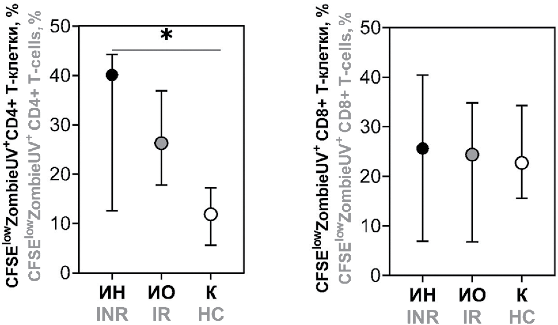 Было установлено, что у ИН среди пролиферирующих в культуре лимфоцитов значительно увеличивается доля гибнущих Т-клеток (рис. 3). Примечательно, что это было характерно для CD4⁺ Т-лимфоцитов, но не для CD8⁺ Т-клеток.