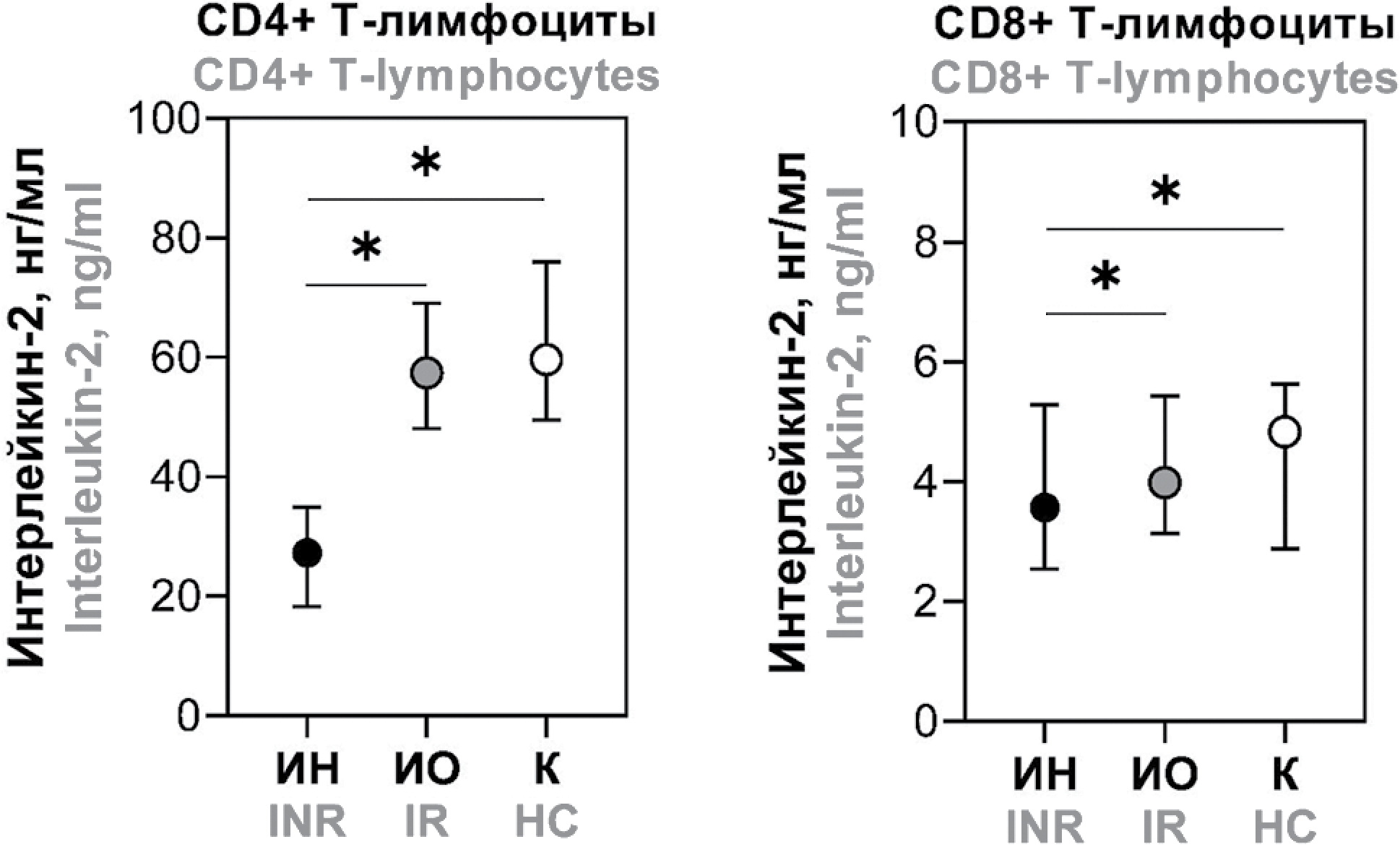 Для определения цитокин-продуцирующей способности Т-лимфоцитов из образцов выделяли CD4⁺ и CD8⁺ Т-клетки. Негативную селекцию проводили с использованием коммерчес ких наборов Dynabeads Untouched Human CD4 T cells (Invitrogen, США) и MagCellect Human CD8⁺ T Cell Isolation Kit (R&D Systems, Inc., США) согласно инструкциям производителей. Долю CD4⁺ и CD8⁺ Т-лимфоцитов в пуле клеток, прошедших процедуру магнитной сепарации, оценивали на проточном цитофлюориметре CytoFLEX S с использованием моноклональных анти-CD3-PerCP, анти-CD4-BV605 и анти-CD8-APC-Fire750 антител (BioLegend, США). Чистота выделенных субпопуляций составила более 92%. Затем изолированные CD4⁺ и CD8⁺ Т-лимфоциты стимулировали магнитными частицами Dynabeads Human T-Activator CD3/CD28 (Gibco, США) и культивировали в ППС, в течение 72 ч (+37°С, 5% СО2). Контролем служили нестимулированные клетки. По истечении времени инкубации собирали супернатанты, в которых определяли концентрации интерлейкина-2 (IL-2) методом иммуноферментного анализа с использованием коммерческого набора «Интерлейкин-2-ИФА-БЕСТ» (Вектор БЕСТ, Россия). Концентрацию цитокина выражали в нг/мл.