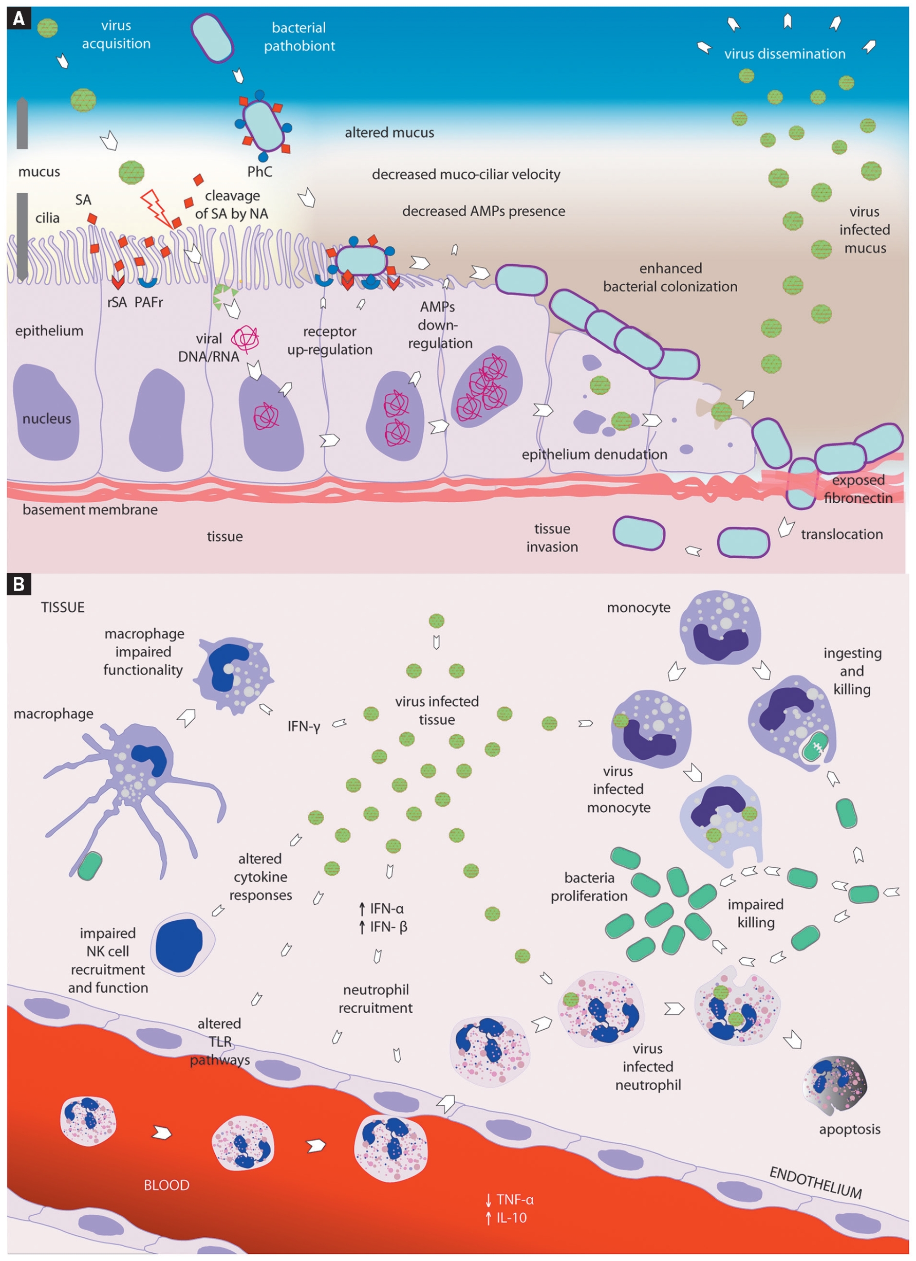 Note. (A) Interaction on the respiratory epithelial surface: Viruses can make the respiratory tract more vulnerable to bacterial colonization by damaging mucosal surfaces, reducing ciliary function, and compromising epithelial integrity. Infected cells may also decrease antimicrobial peptide expression and expose bacterial receptors through neuraminidase activity. Additionally, viruses can directly or indirectly enhance bacterial colonization by upregulating receptors required for bacterial adherence. (B) Interaction with the host immune system: Viral infections can alter immune function, favoring bacterial invasion. This includes reducing the recruitment and functionality of NK cells and impairing neutrophil recruitment and function. Viral-induced interferons may also affect macrophage activity and decrease pro-inflammatory cytokine levels, leading to impaired immune responses to bacterial infections [4].