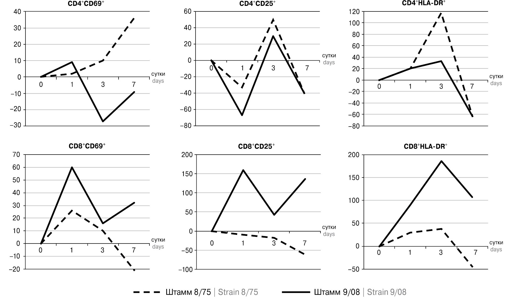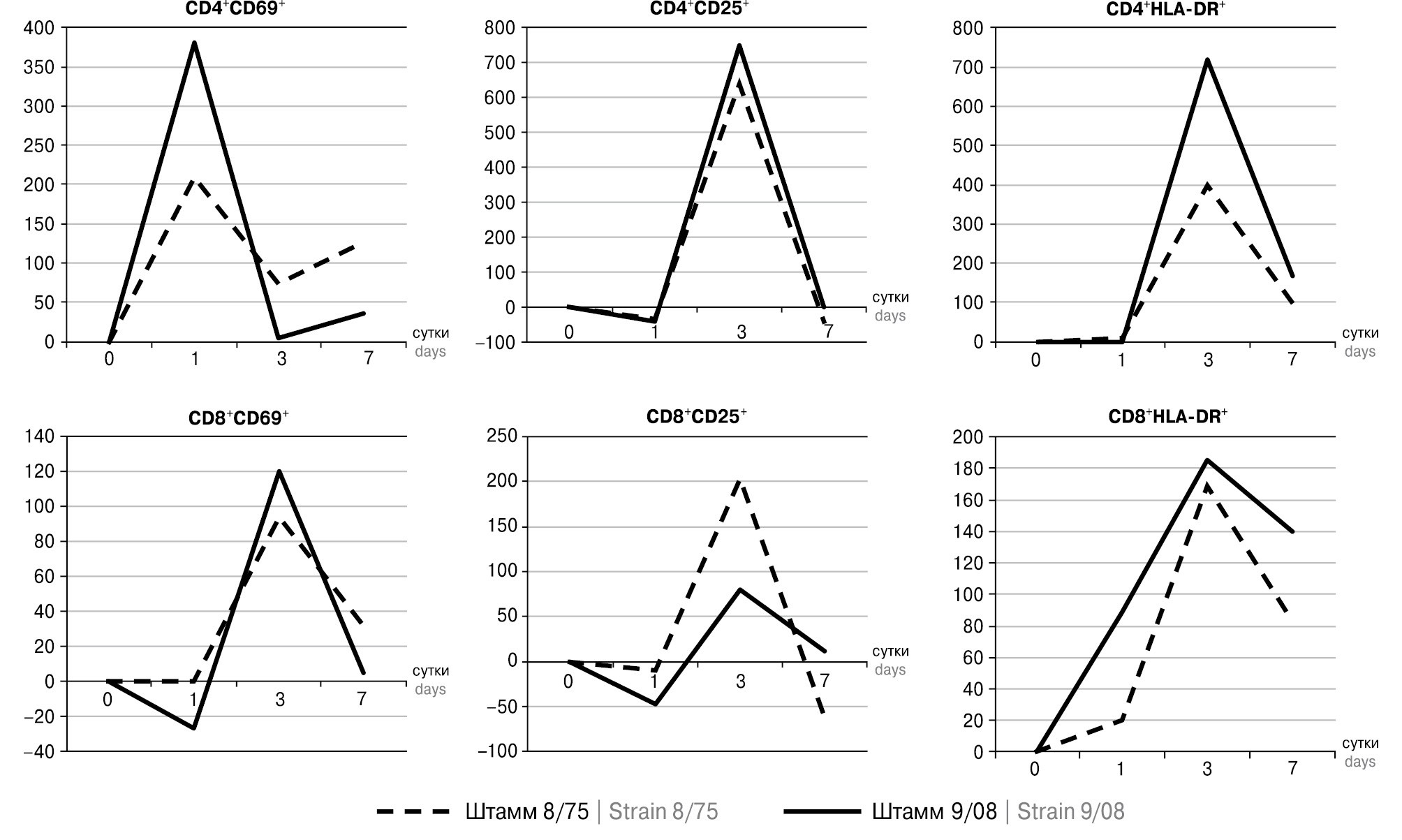 МБ-Т (рис. 3) штаммов 9-08-CH9 и 875 TS у обоих субпопуляций Т-лимфоцитов достоверно стимулировали экспрессию маркеров ранней, средней и поздней активации.