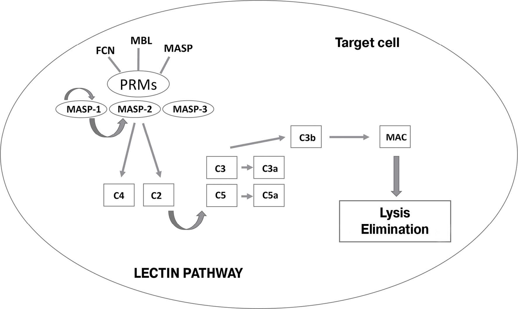 Все три пути комплемента инициируются множеством стимулов независимо друг от друга, и впоследствии протеолитические каскады сходятся к активации основного компонента C3, что приводит к сборке мембраноатакующего комплекса [15]. Лектиновый путь (ЛП) может активироваться в отсутствие иммунных комплексов и инициироваться путем связывания молекул суперсемейства паттерн-распознающих рецепторов (лектинов), таких как маннозосвязывающий лектин (MBL), коллектин 11 (CL-K1) или фиколины, с углеводами или ацетилированными остатками, присутствующими на поверхности патогенов или собственных апоптотических/опухолевых клеток [6]. Циркулирующие MBL, CL-K1 и фиколины образуют комплексы со специфическими сериновыми протеазами (Mannose-Binding lectin-associated Serine Protease, MASP): MASP-1 и MASP-2. После связывания комплексов MBL/MASP, CL-K1/MASP или фиколин/MASP с их мишенями, MASP-1 может автоматически активироваться и запустить MASP-2 [41], приводя к расщеплению C4 и C2. Это обеспечивает сборку конвертаз C3 и C5 с их последующей активацией и генерацией, соответственно, C3a и C5a — двух провоспалительных анафилатоксинов, которые усиливают воспалительную реакцию. Таким образом, образование сложного комплекса «полисахариды микробной стенки + коллектин/фиколин + специфические протеазы (MASP-1, MASP-2 и MASP-3)» приводит к активации ЛП системы комплемента, воспалительной реакции и элиминации бактерии (рис.).