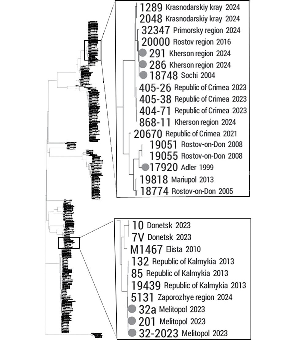 Примечание. Клинические изоляты отмечены серыми кружками. На дендрограмме показаны только 2 из 21 идентичного штамма из Краснодарского края 2024 г.