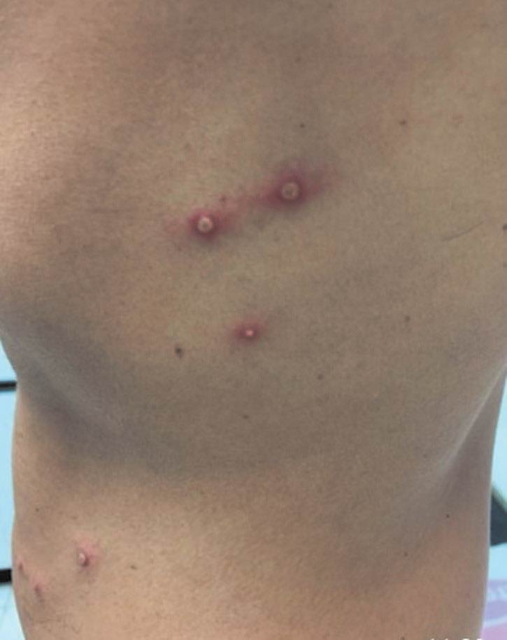 Рисунок 2. Единичные пустулезные элементы в области правой голени