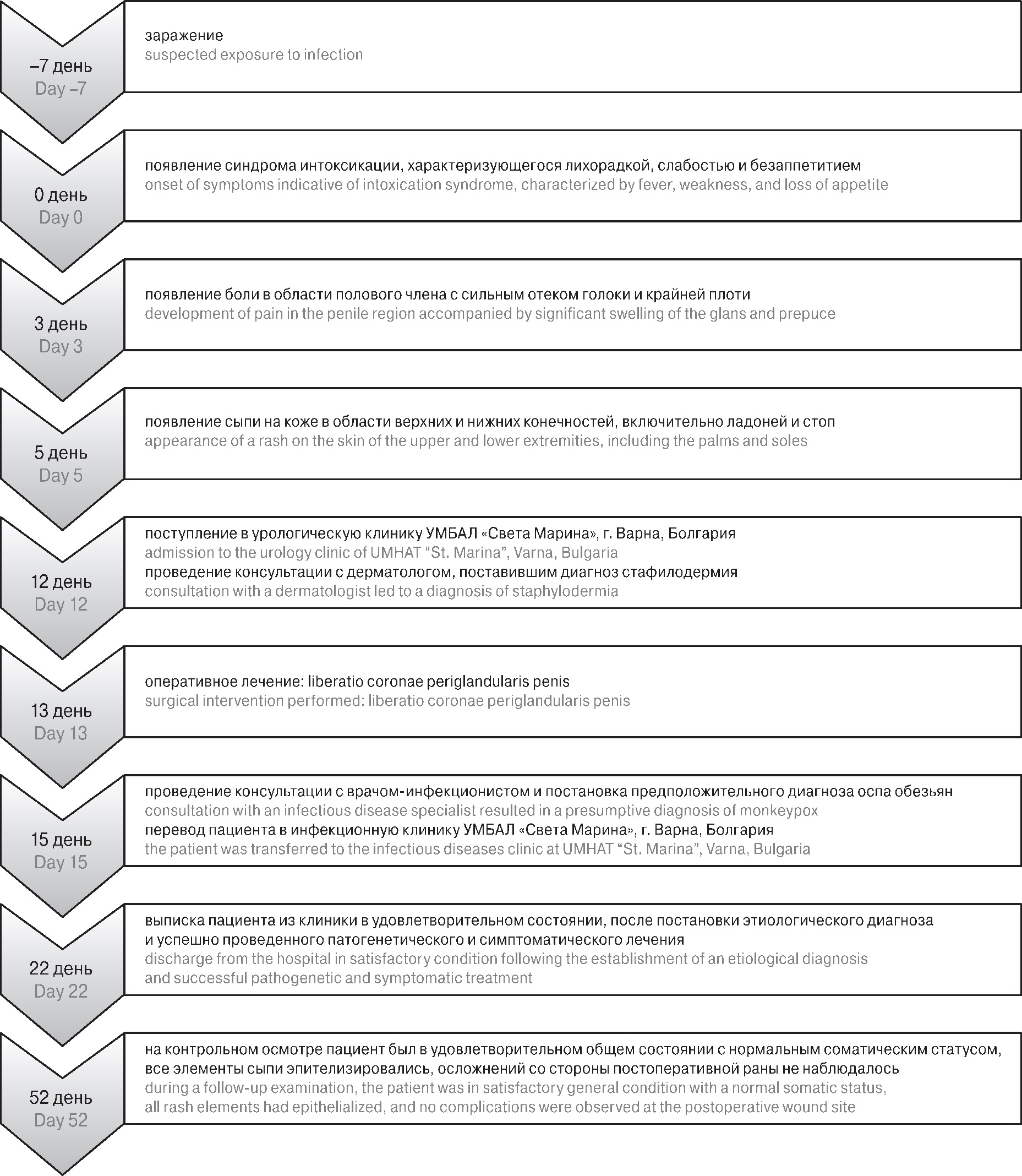 Клиническое течение MPOX может варьироваться от легкого, самоограничивающегося заболевания до тяжелой формы с жизнеугрожающими осложнениями у лиц с иммунодефицитом. Инкубационный период составляет от 2 до 21 дня, затем следует продромальный период, длящийся от 1 до 5 дней. В этот период наблюдаются такие симптомы, как лихорадка (62–72%), лимфаденопатия (56–86%), миалгия (31–55%), общее недомогание (23–57%) и головная боль (25–55%). Характерным клиническим признаком MPOX является болезненная сыпь, которая появляется через 2–3 дня от начала продромального периода и проходит четыре четко определенные стадии развития на протяжении 2–4 недель. Начальные поражения кожи представлены макулами, которые последовательно трансформируются в папулы, а затем в везикулы и пустулы, а на заключительном этапе покрываются корками. Сыпь может появляться в несколько этапов, обуславливая характерный псевдополиморфизм. Пациент остается заразным с момента появления клинических симптомов до полного заживления всех кожных поражений, что обычно занимает до 4 недель. Сыпь при MPOX, как правило, имеет центробежный характер, поражая лицо, туловище и конечности. MPOX может вызывать осложнения, такие как некротизирующие поражения кожи, пневмония и энцефалит, особенно у лиц с иммунодефицитами [7]. В представленном клиническом случае пациент указал на единственный половой контакт за 7 дней до появления первых продромальных симптомов, что соответствует описанным в литературе данным. Продолжительность продромального периода, составившая 3 дня, также согласуется с приведенной в медицинских источниках информацией (рис. 3). Осложнениями MPOX в данном случае стали баланопостит и кавернит, что является редким проявлением данного инфекционного заболевания.