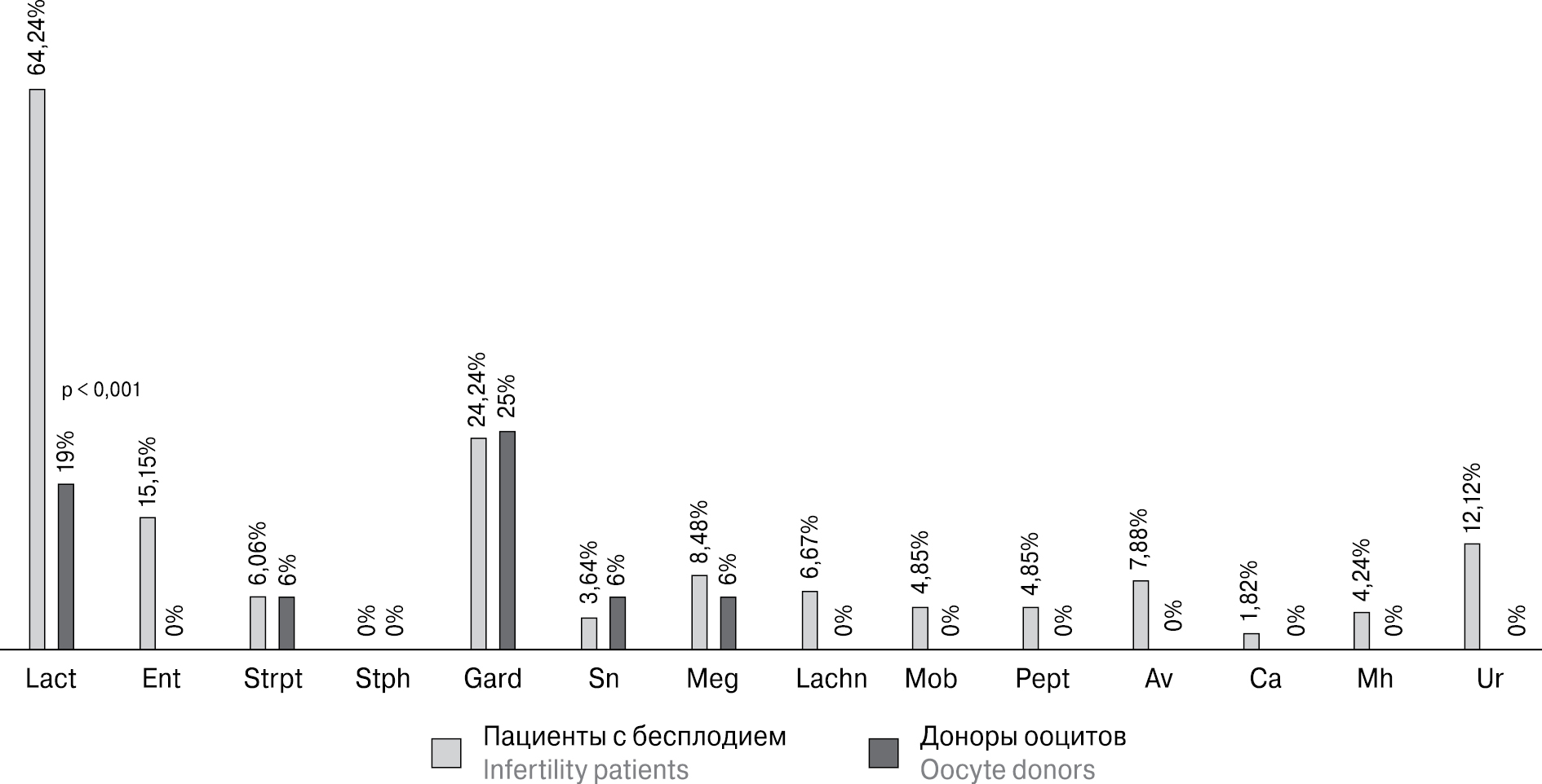 При анализе микробиоты эндометрия установлено, что чаще всего выявлялись микроорганизмы рода Lactobacillus, что характерно для физиологического микробиоценоза. У пациенток I группы лактобациллы встречались с частотой 64,2%, а во II группе в 19% случаев, различие статистически значимо (р < 0,001). Среди женщин с бесплодием частота выявления Gardenerella vaginalis была одинаковой с частотой их обнаружения в группе доноров ооцитов, Atopobium vaginae выявлялась с частотой 8% в основной группе и не выявлялась в группе сравнения. Та же картина наблюдалась относительно других микроорганизмов, таких как Enterobacteriaceae, Lachnobacterium spp., Mobiluncus spp., Peptostreptococcus, Mycoplasma hominis, Ureaplasma spp. В основной группе эти микроорганизмы были выявлены в единичных случаях, а в группе сравнения не были обнаружены ни в одном случае. Эти данные представлены на рисунке.