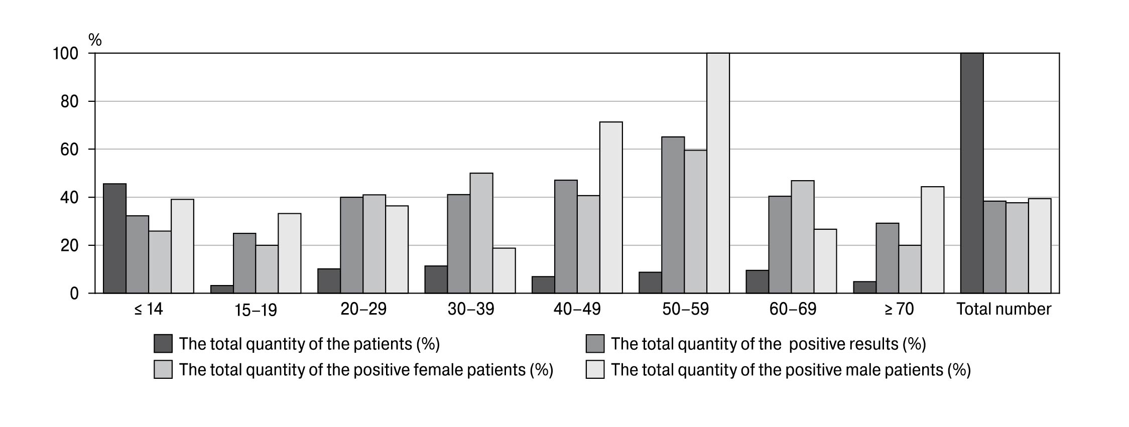 To detection of microorganisms HP, individuals of different age groups were examined: 45.6% (226 people) were up to 14 years old, 3.2% (16 people) were 15–19 years old, 10.1% (50 people) were 20–29 years old, 11.3% (56 people) were 30–39 years old, 6.9% (34 people) were 40–49 years old, 8.7% (43 people) were 50–59 years old, 9.5% (47 people) were 60–69 years old, and 4.8% (24 people) were 70 years old or older.