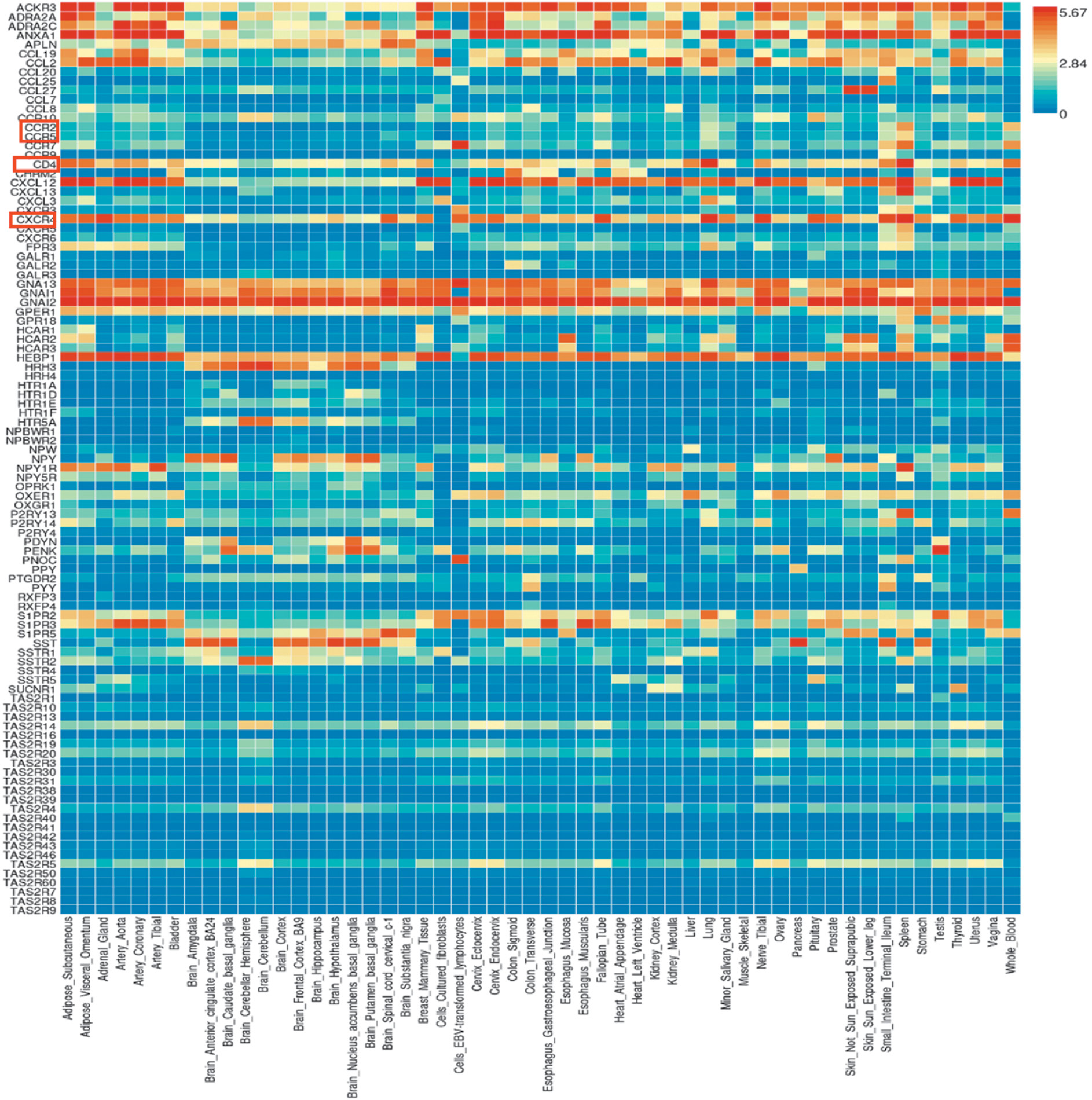 Figure 3. Tissue-specific expression map for background genes (CCR5, CXCR4, CD4, CCR2) and candidate genes (CGs). CCR5, CXCR4, CD4, and CCR2 are highlighted with a red border