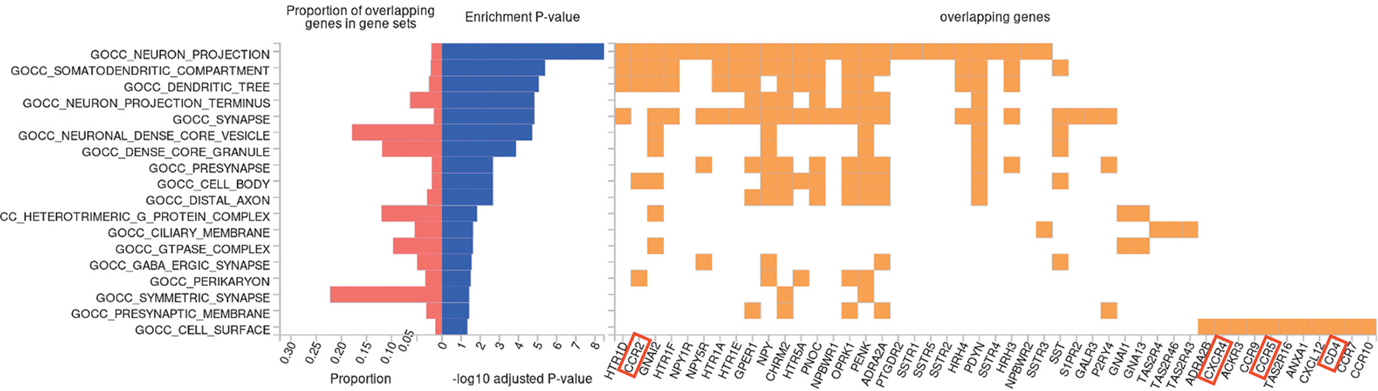For the products of the genes CXCR4, CD4, and CCR5, only localization in the cell membrane is shown, approaching the level of significance. To rank the significance of the candidate gene products, a correlation analysis between gene pairs was performed. Since the products of CCR5, CXCR4, and CD4 do not have a shared localization with the products of other genes, the correlation assessments were conducted with respect to CCR2.
