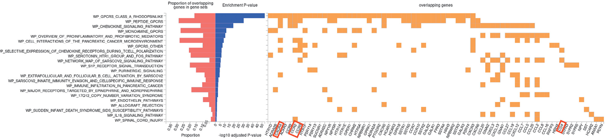 The main functional groups of genes, their proteins, and metabolites are associated with G-proteins, peptide signaling pathways of G-proteins, chemokine signaling pathways that influence inflammatory processes, as well as those related to monoamine receptors. The three biological pathways with the highest p-values were: WP_GPCRS_CLASS_A_RHODOPSINLIKE (rhodopsin-like receptors, G-protein coupled class A) with the highest p-value; WP_PEPTIDE_GPCRS (peptide receptors, G-protein coupled); and WP_CHEMOKINE_SIGNALING_PATHWAY (chemokine signaling pathways). The presence of CCR2, CXCR4, and, partially, CCR5 in these pathways indicates their important role in these biological processes.