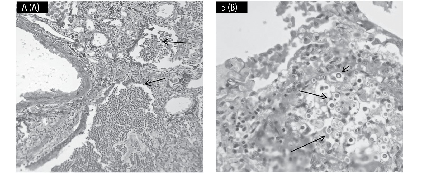 На аутопсии — легкие с наружной поверхности красно-серого цвета, тестовато-отечной консистенции. С поверхности разреза с обильным геморрагически-пенистым содержимым; в нижних отделах легкие темно-синюшно-красного цвета, плотные, с мелкими очагами в легочной паренхиме. При микроскопическом исследовании отмечалось чередование умеренно воздушных альвеол с очаговыми эмфизематозными альвеолами. Межальвеолярные перегородки неравномерно утолщены за счет полнокровия. В просвете альвеол очагово-распространенно лейкоцитарная инфильтрация (рис. 1А), отечная жидкость, гемосидерофаги; в единичных полях зрения на межальвеолярных перегородках фокусы гранулем с криптококками (рис. 1B), лимфогистиоцитами, макрофагами и единичными многоядерными гигантскими клетками. Сосуды полнокровные.
