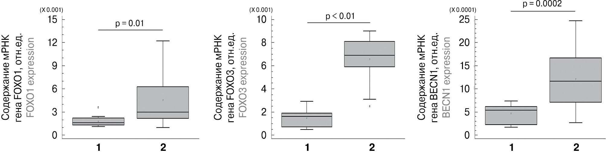 Рисунок. Уровень транскриптов генов FOXO1, FOXO3 и BECN1 в лейкоцитах периферической крови пациентов c хроническим течением саркоидоза легких (2) и в контрольной группе (1)